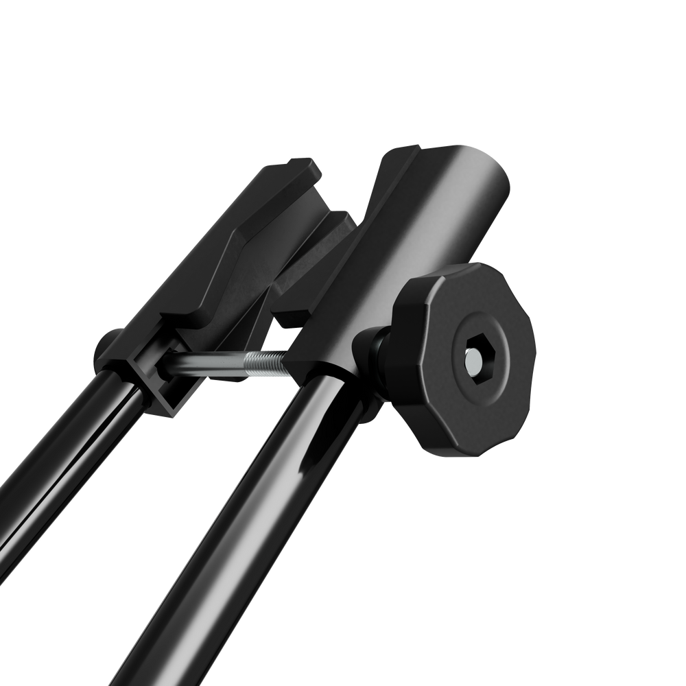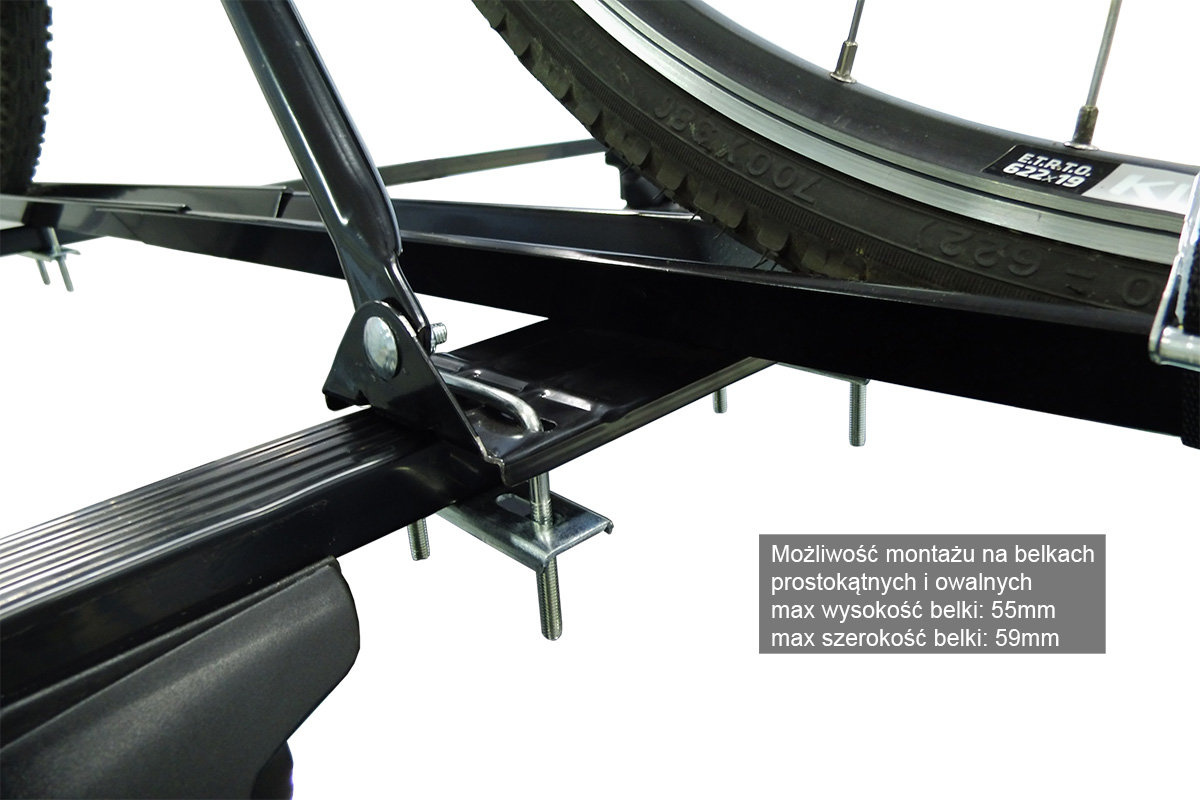 Držák se připevňuje ke střešním nosičům pomocí přiložených svorek (U-šroubů) kompatibilních s nosiči (hliníkovými a ocelovými) do šířky 59 mm .