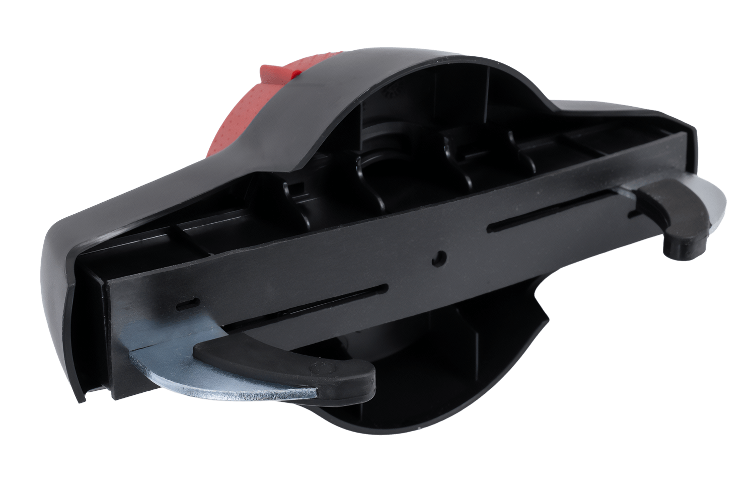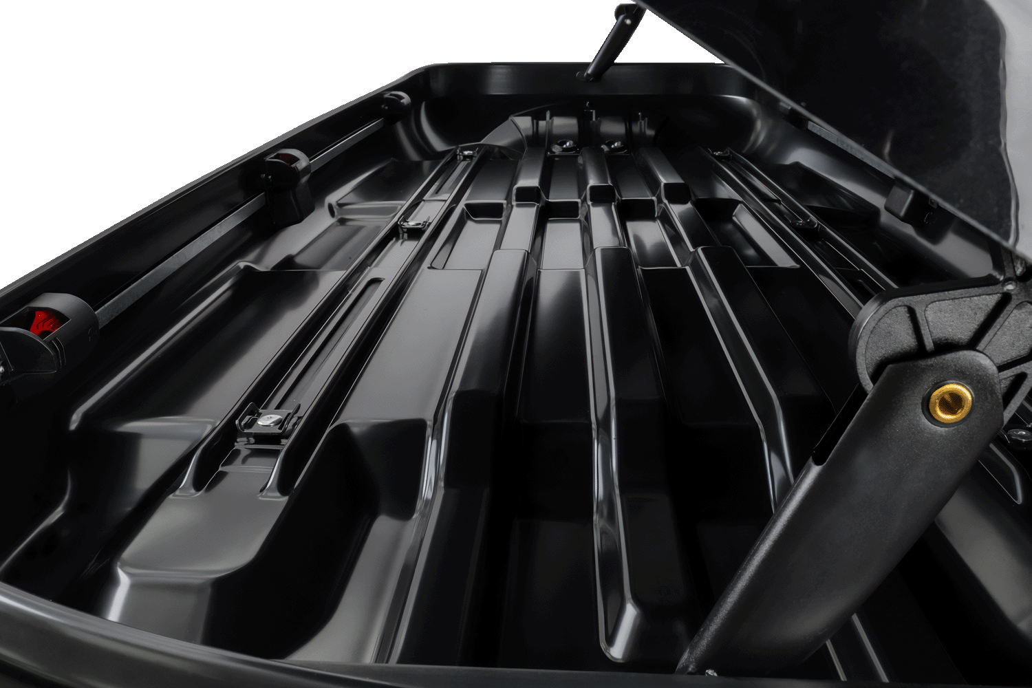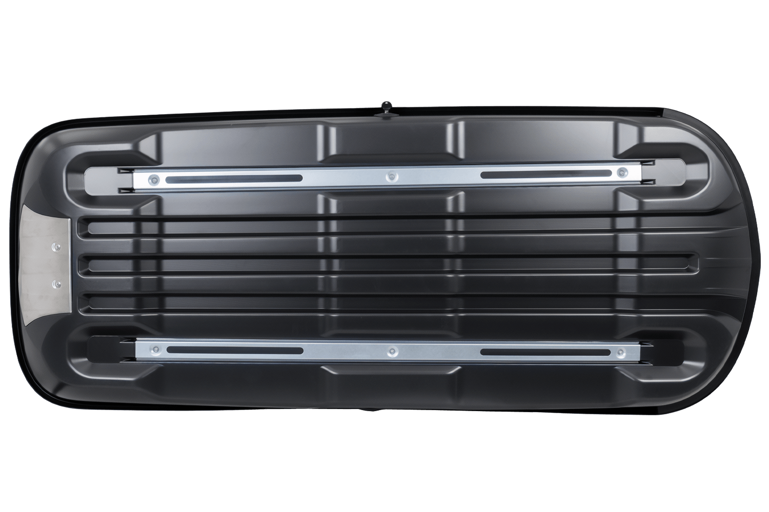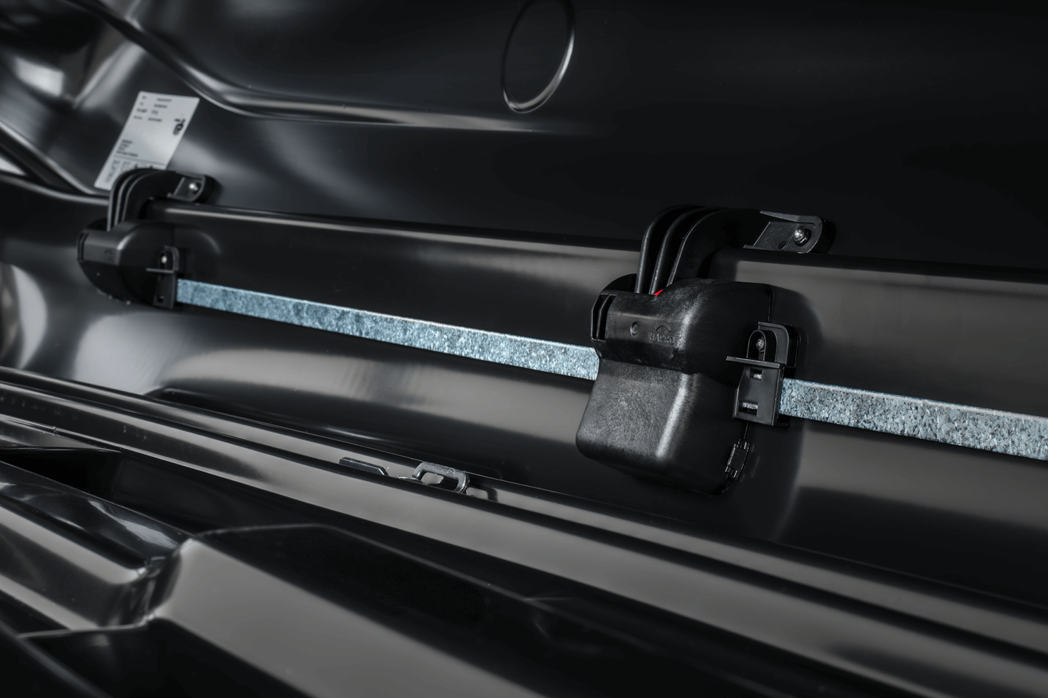 Posuvné upevnění ve vodících lištách umožňuje přizpůsobit box rozteči nosníků střešního nosiče v rozmezí 55 až 95 cm .