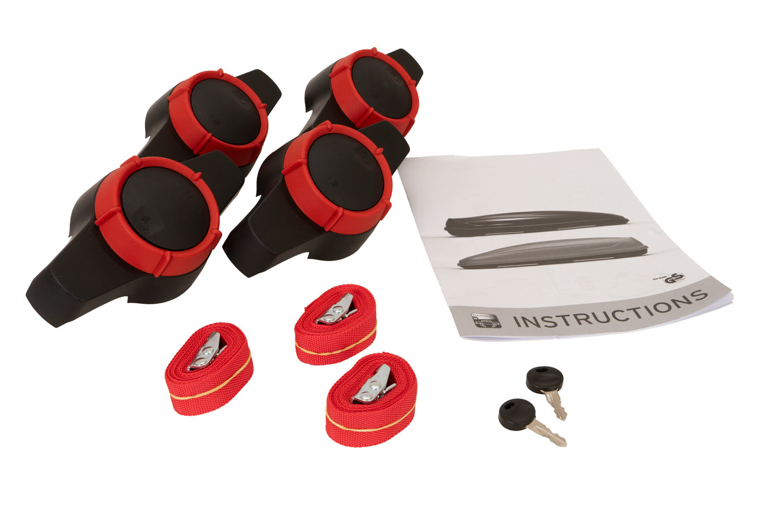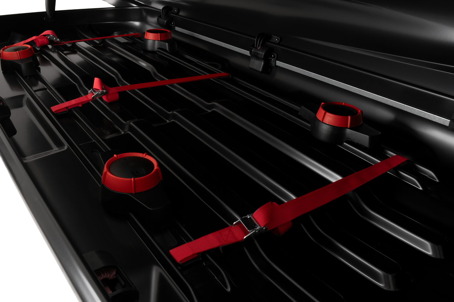 Tyče nosiče by měly být od sebe rozestupy 55 až 95 cm . Sada obsahuje také textilní popruhy pro dodatečné zajištění zavazadel.