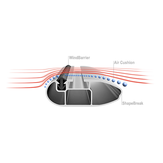 WindBarrier navíc vytváří malé víry, které na povrchu příčníku vytvářejí vzduchový polštář, jenž funguje jako most pro proudění vzduchu přes T-drážku a zabraňuje hluku za všech jízdních podmínek. Ani při nezatíženém voze není nutné drážku zakrývat, aby se zabránilo hluku.