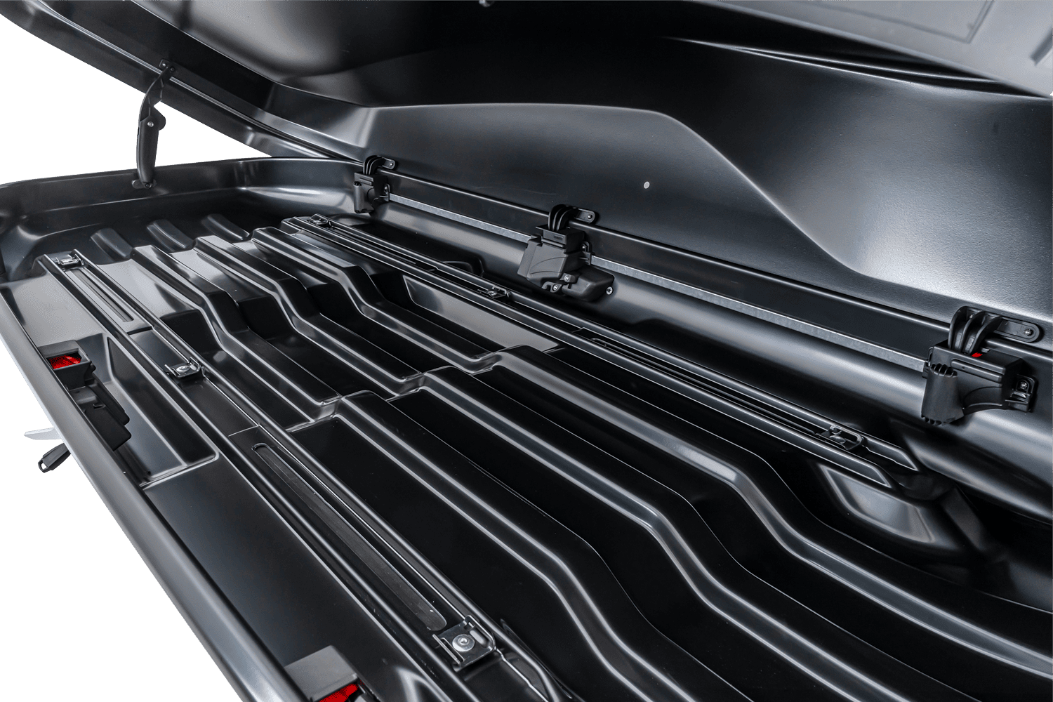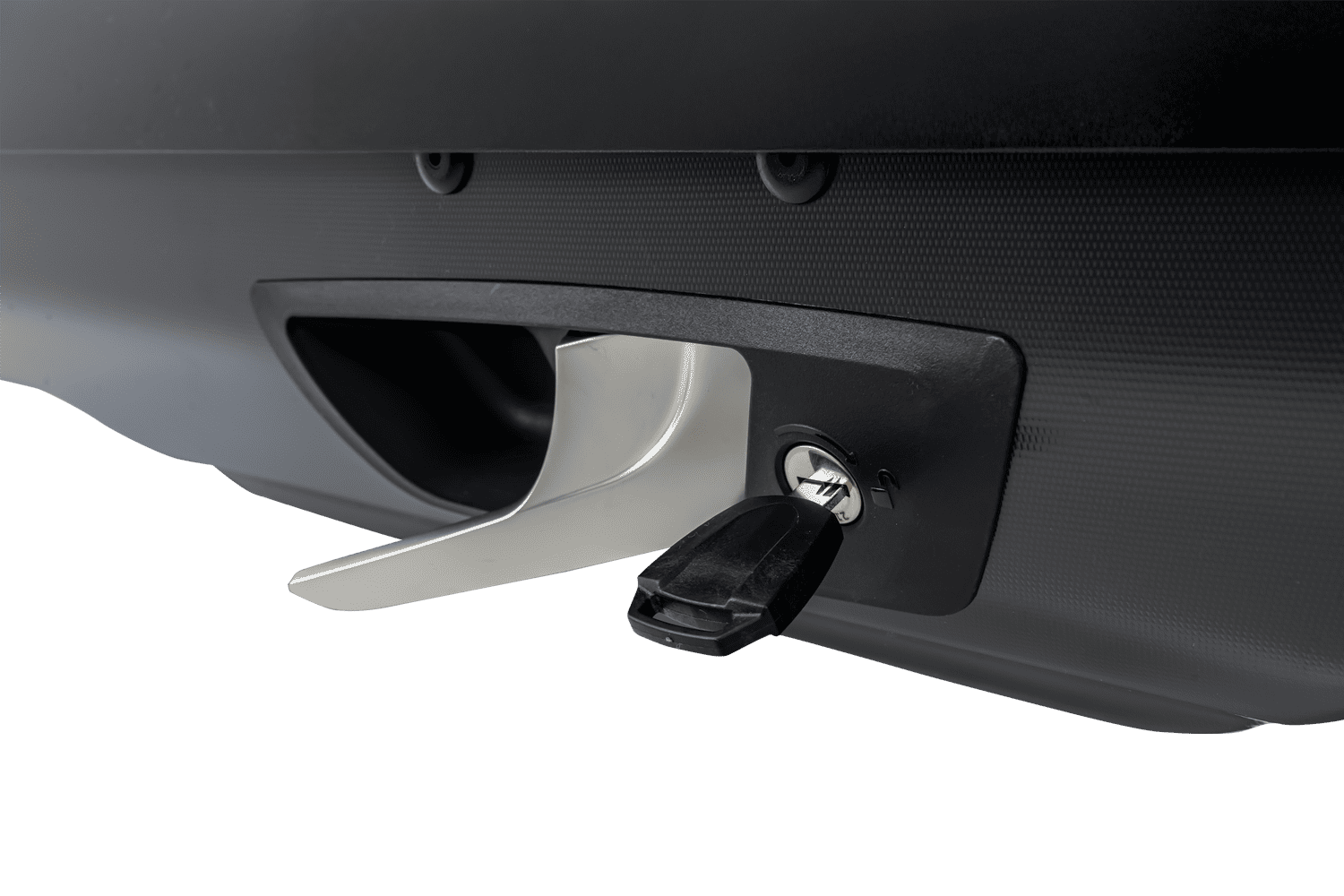 Konstrukce je vyrobena z vysoce kvalitního ABS plastu, odolného vůči UV záření a drsným povětrnostním podmínkám , což zaručuje dlouhodobou životnost. Systém Safe Guard chrání víko před neúmyslným otevřením a signalizuje jeho správné zavření, zatímco tříbodový centrální zamykání chrání přepravované předměty – klíč lze vyjmout až po úplném zavření boxu.
