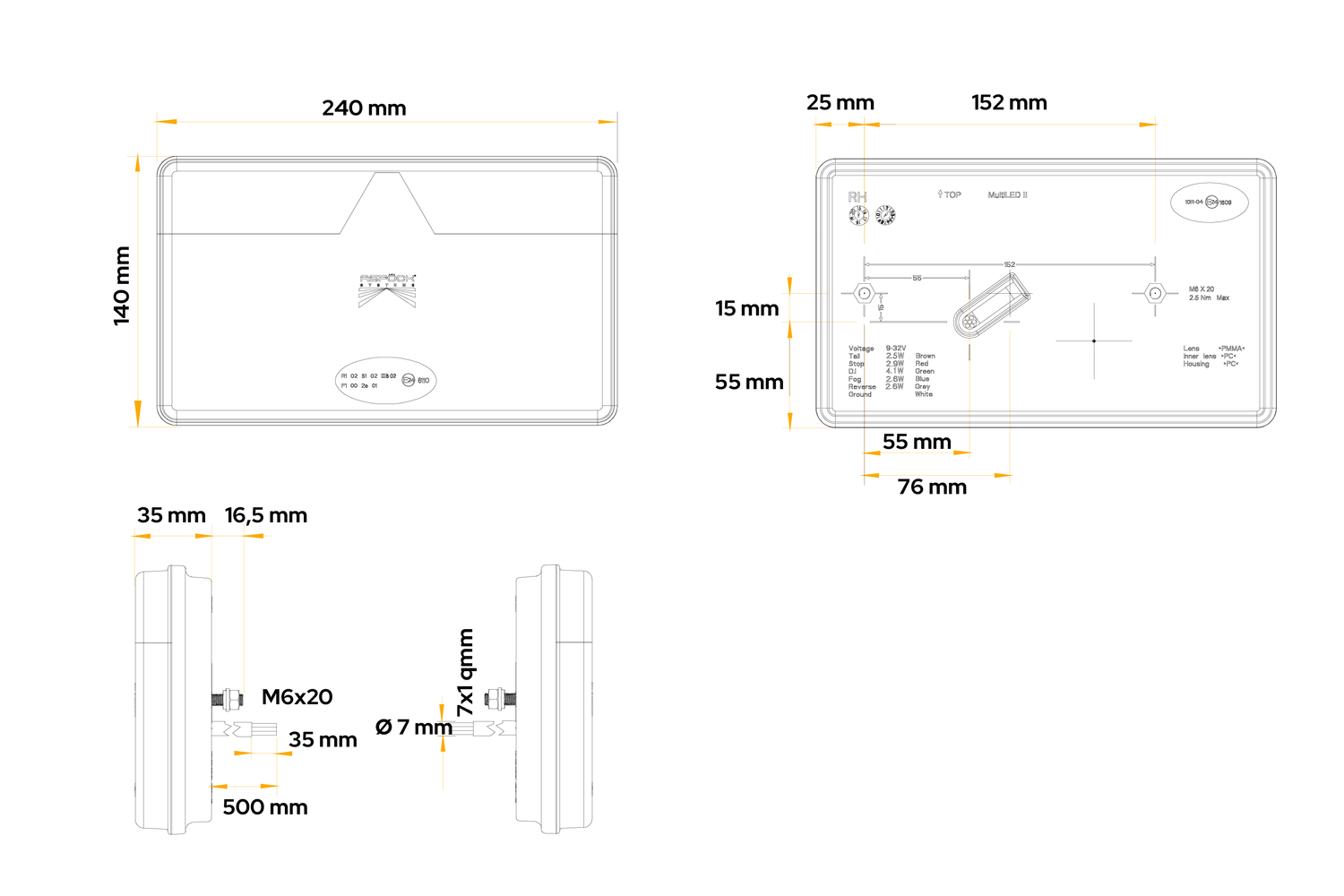 Zadní svítilna ASPÖCK Multiled II LED je určena pro montáž na levou stranu vozidla a má tyto rozměry: šířka 240 mm, výška 140 mm, hloubka 35 mm . Uzpůsoben pro provoz v rozsahu napětí 12-24 V se používá v přívěsech, nákladních a odtahových vozech, což zdůrazňuje jeho univerzálnost. Vybaven 0,5 m kabelem zakončeným 5pinovým bajonetovým konektorem umožňuje snadnou a rychlou instalaci. Díky použití technologie LED lampa zajišťuje vysokou účinnost, odolnost a energetickou účinnost, což zaručuje bezpečnost v různých podmínkách vozovky.