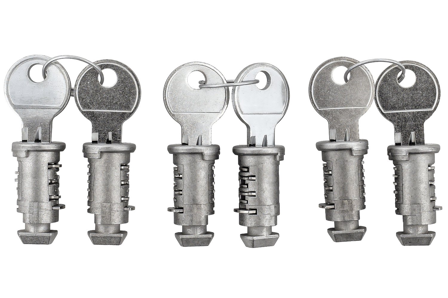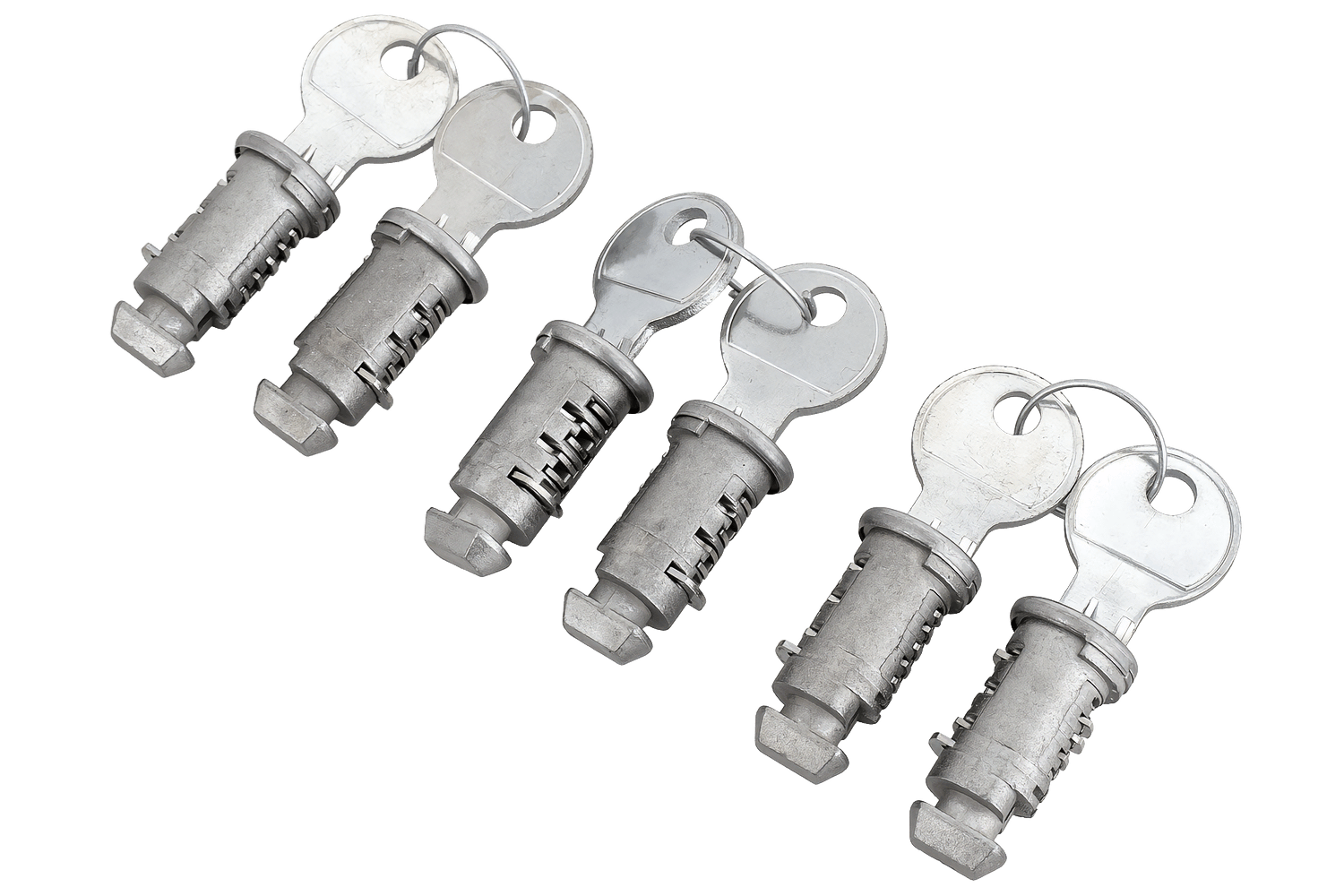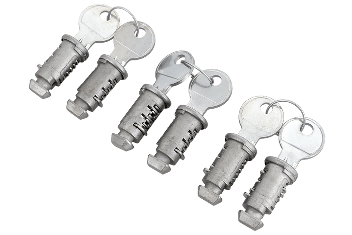 Univerzální zámky pro nosiče kol, střešní nosiče, sportovní nosiče nebo bezpečnostní knoflíky. Vložky zámků v sadě mají stejné číslo vložky a klíče.