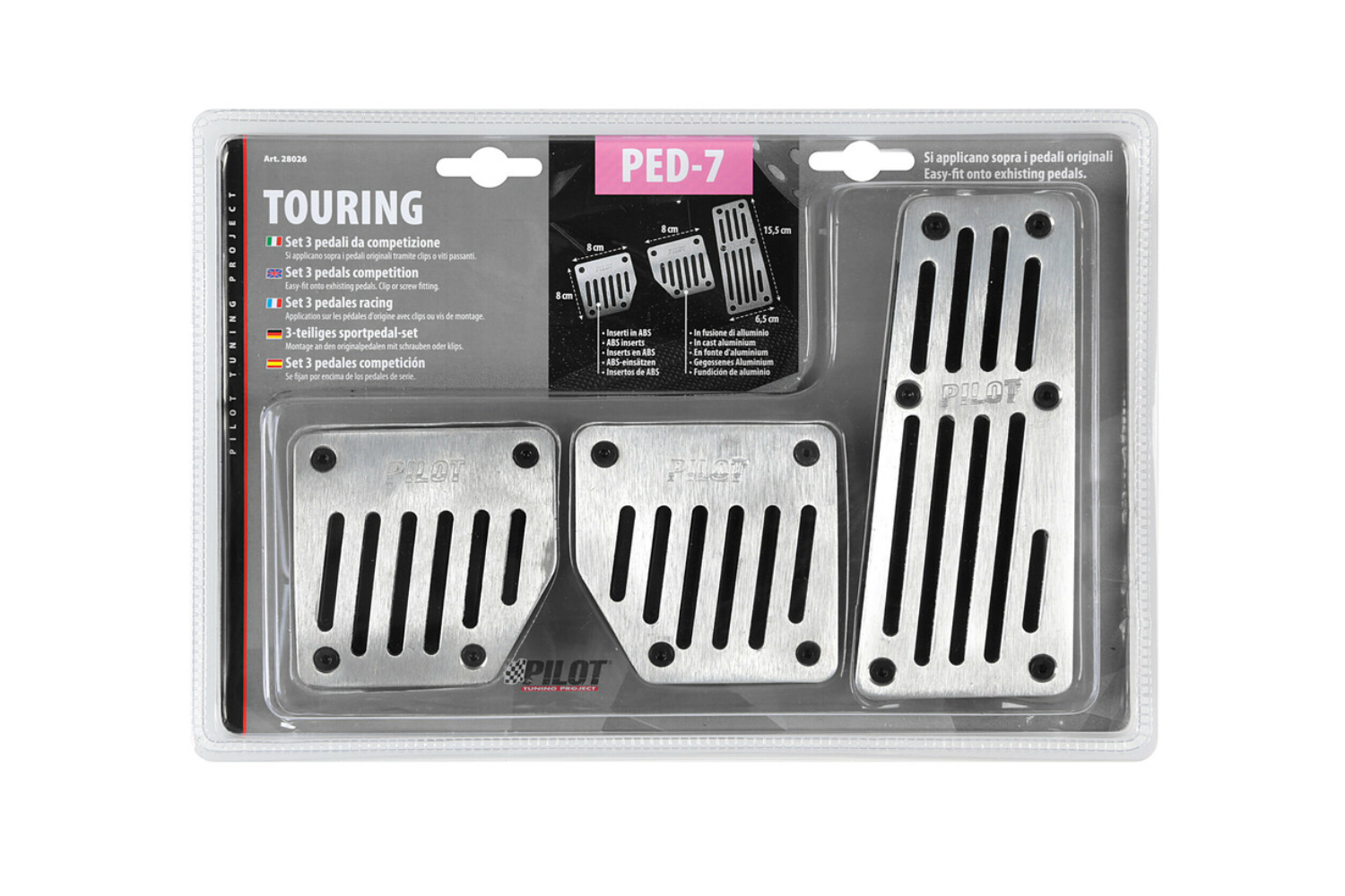 Hliníkové kryty pedálů TOURING BLACK od LAMPY představují praktický a stylový způsob, jak oživit interiér vašeho vozu a zlepšit jízdní komfort. Sada obsahuje kryty na plynový, brzdový a spojkový pedály . Jsou vyrobeny z lehkého a odolného hliníku s černou povrchovou úpravou a kombinují elegantní cestovní design s funkčností, která se promítá do jistějšího šlapání při každodenní jízdě i delších cestách.