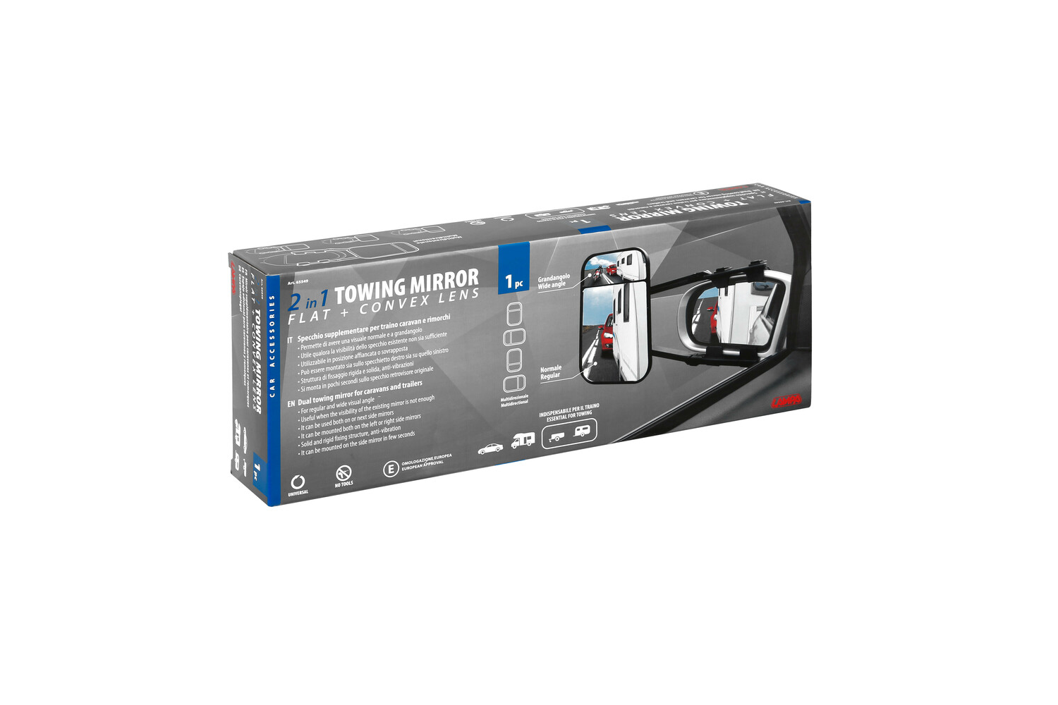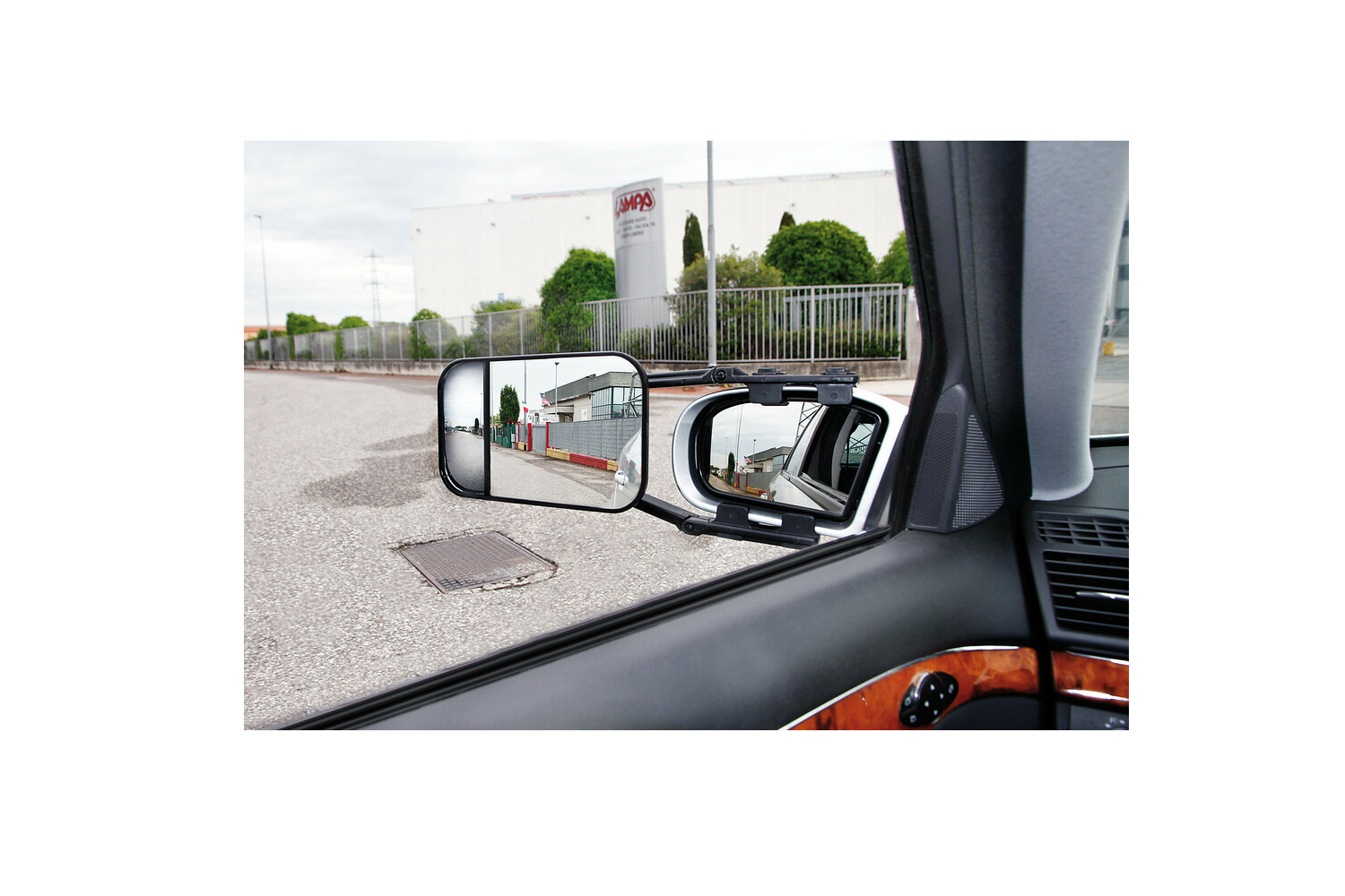 Ploché a konvexní tažné zrcátko je univerzální příslušenství, které se montuje na boční zrcátko z výroby . Dvouvrstvá konstrukce rozšiřuje zorné pole a plné nastavení umožňuje ideální pozorovací úhel. Systém upevnění pomocí upínacích prvků je vhodný pro většinu zrcátek; žebříkové popruhy je bezpečně drží na místě a snižují vibrace během jízdy. Zrcátko je univerzální a umožňuje jeho montáž na levou i pravou stranu vozidla. Produkt je schválen dle normy ECE R46 .