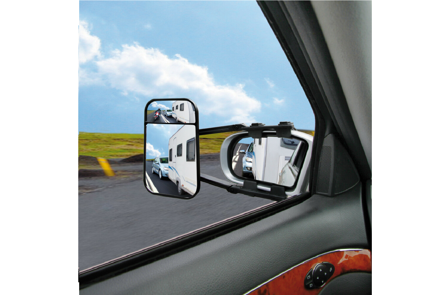 - Zrcátko pro přívěs – přídavné zrcátko, které se montuje přes tovární zrcátko, má dvě čočky (ploché a konvexní). Rozšiřuje zorné pole a omezuje mrtvá místa, což usnadňuje změny jízdních pruhů, couvání a parkování s přívěsem. Rychlá instalace pomocí upínací