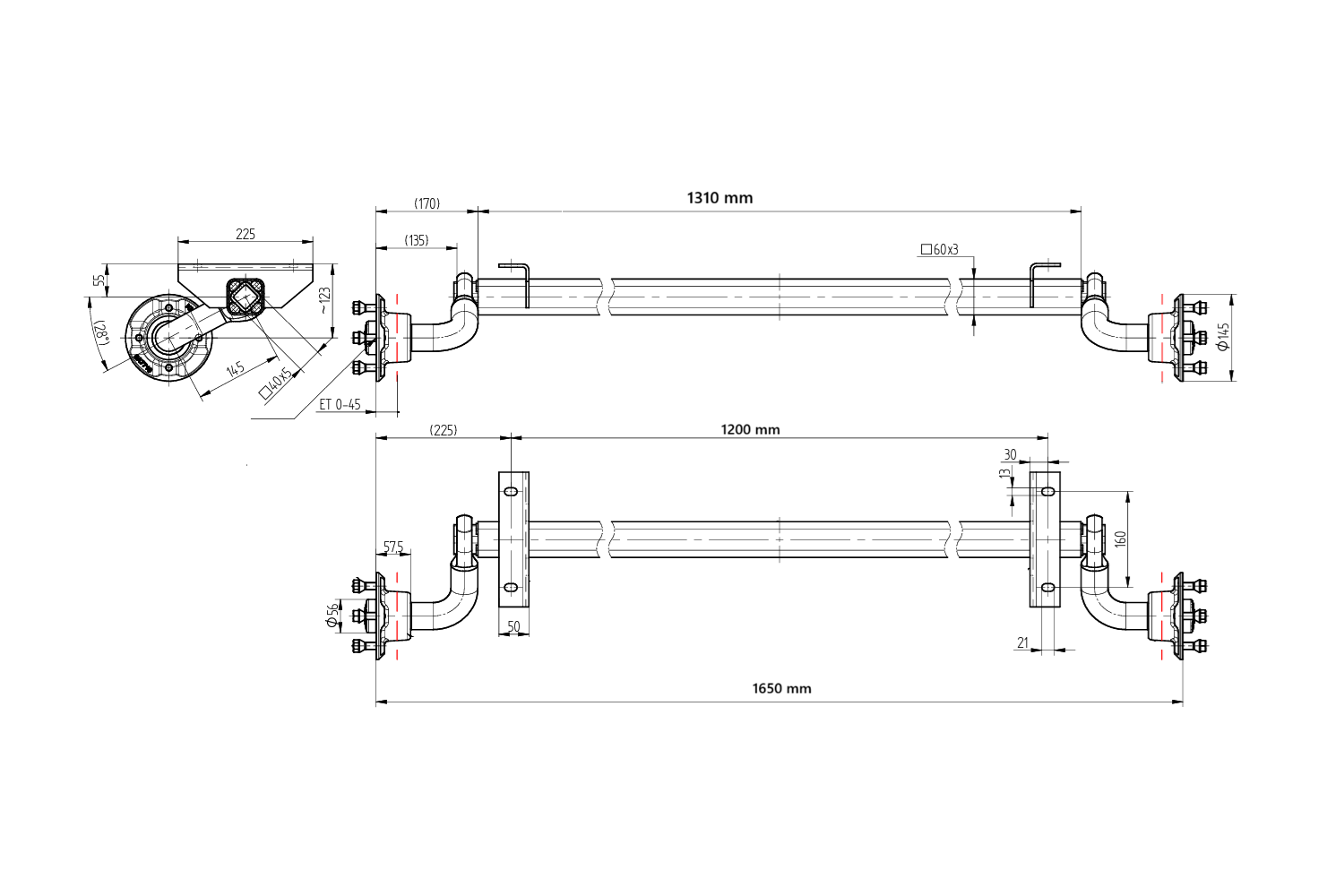 Nebrzděná náprava KNOTT 6A8709.001 je určena pro lehké přívěsy s maximální nosností 750 kg . Rozteč montážních otvorů je 1200 mm a rozteč nábojů je 1650 mm , což umožňuje snadnou instalaci na širokou škálu vozidel. Standardní rozteč šroubů 4x100 zajišťuje kompatibilitu s většinou kol dostupných na trhu. Délka kyvné vidlice je 145 mm , což zajišťuje stabilitu a optimální tlumení nárazů, a tím zvyšuje bezpečnost jízdy i při plném zatížení.