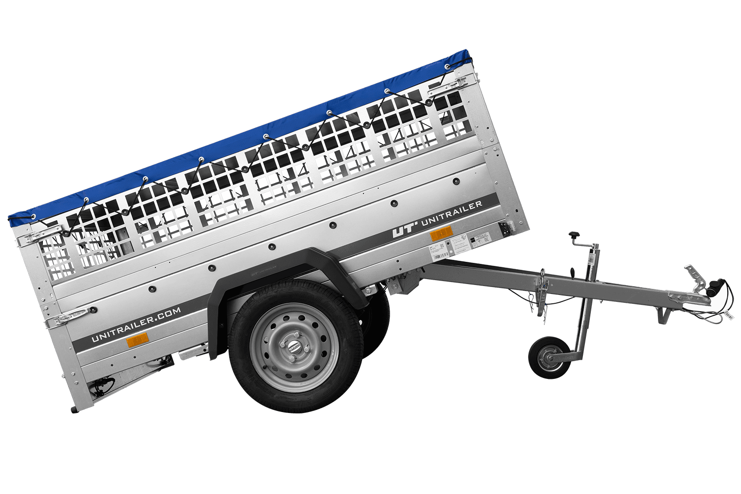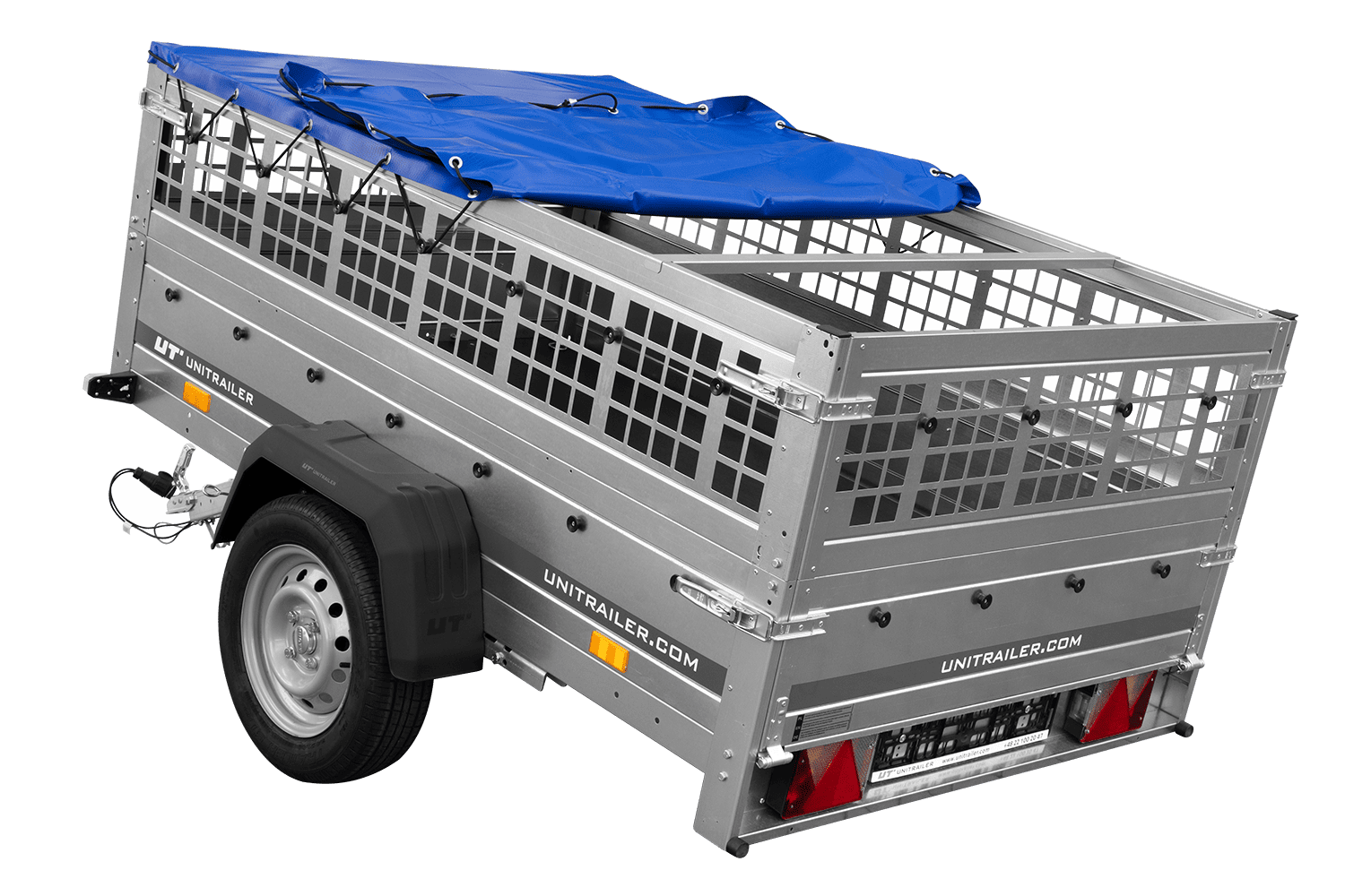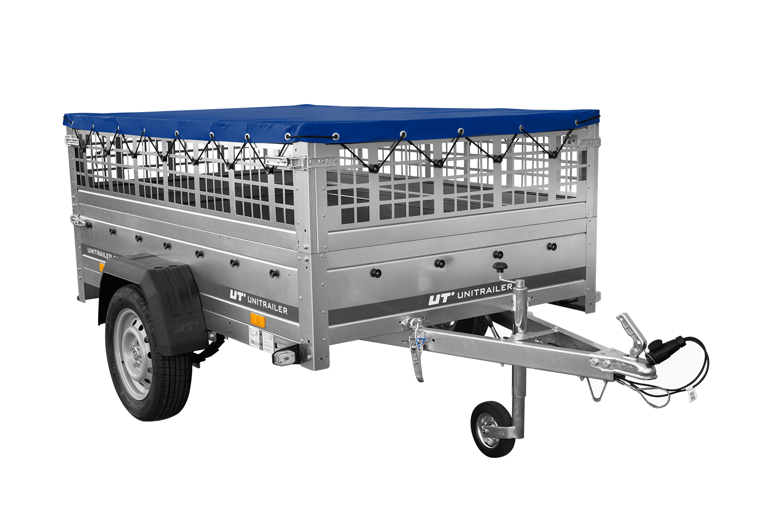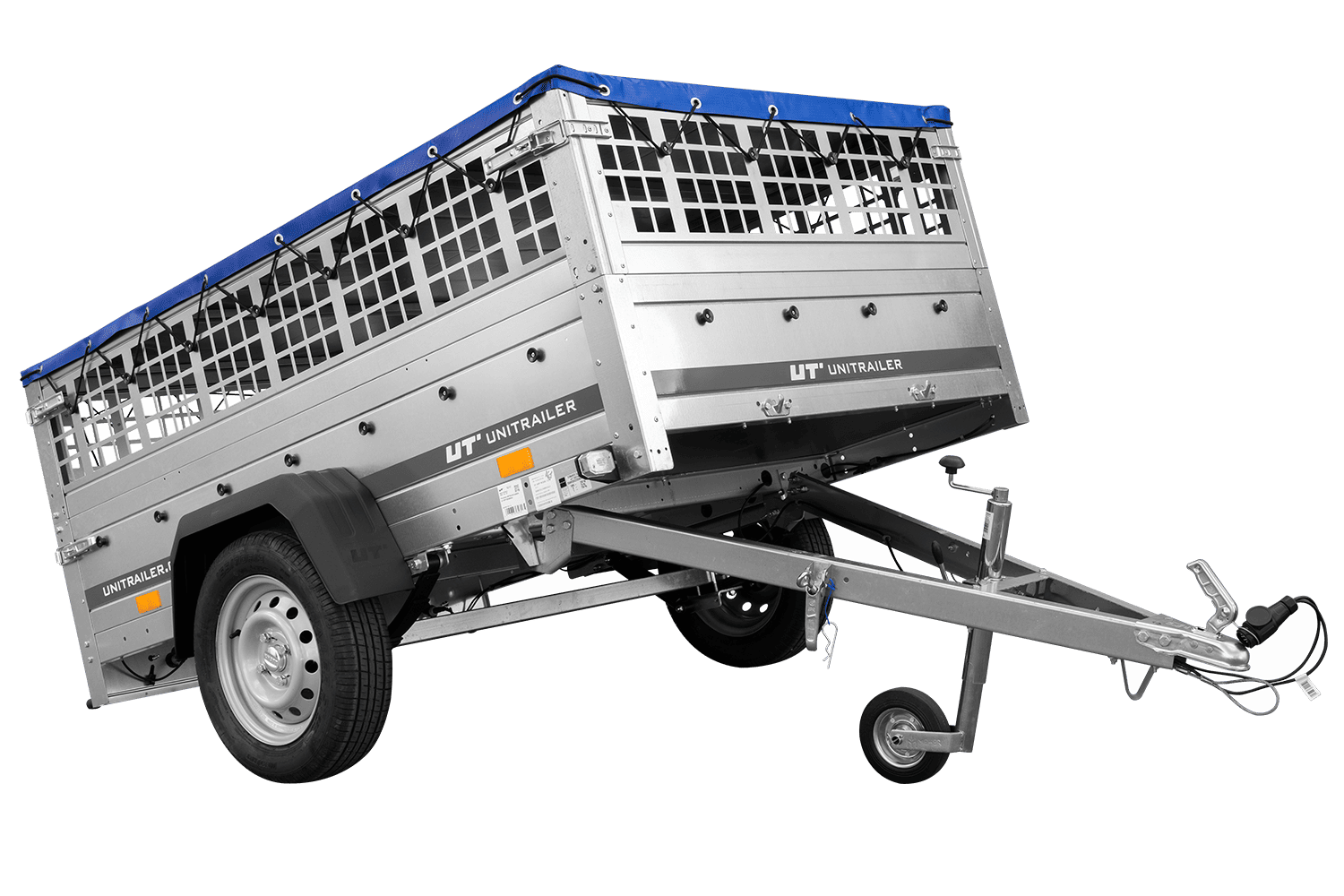 Přívěs za auto na pružinách 200x125 UNITRAILER GARDEN 201/R KIPP s pletivovými bočnicemi, rámem H-0 a modrým krytem