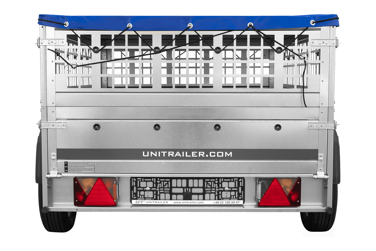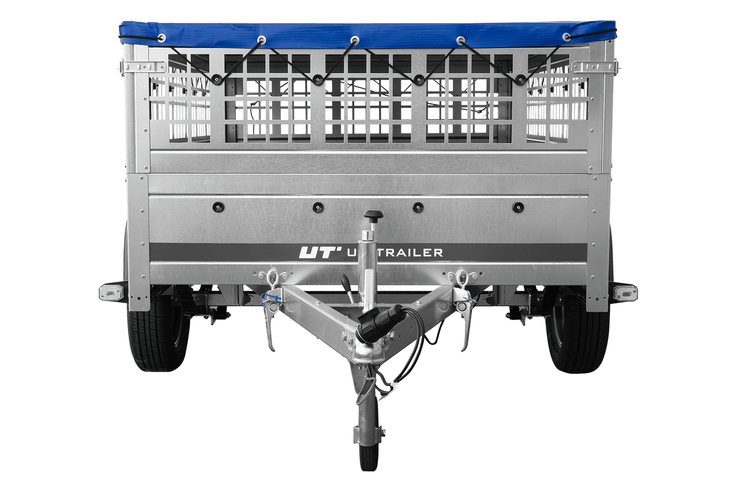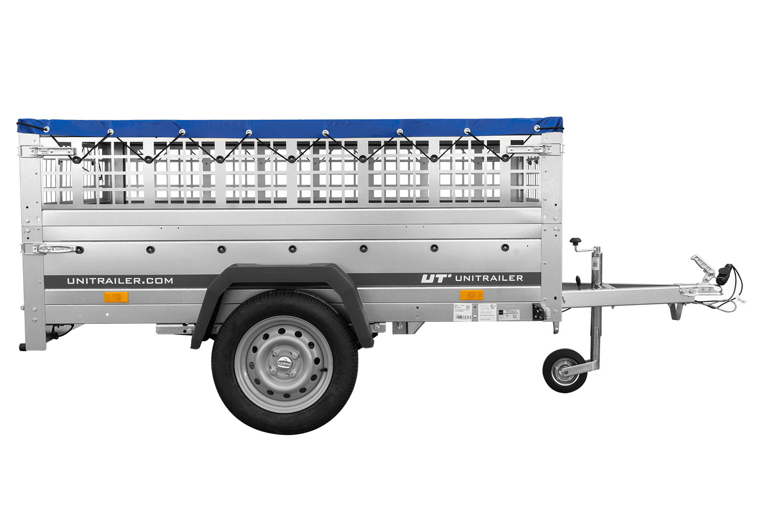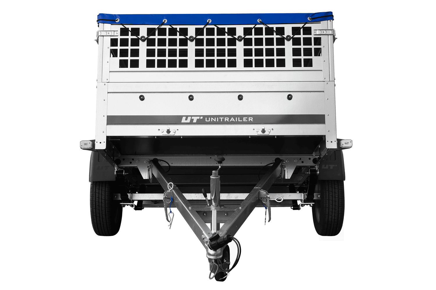 Přívěs za auto na pružinách 200x125 UNITRAILER GARDEN 201/R KIPP s pletivovými bočnicemi, rámem H-0 a modrým krytem