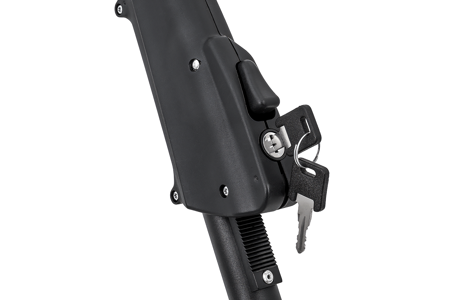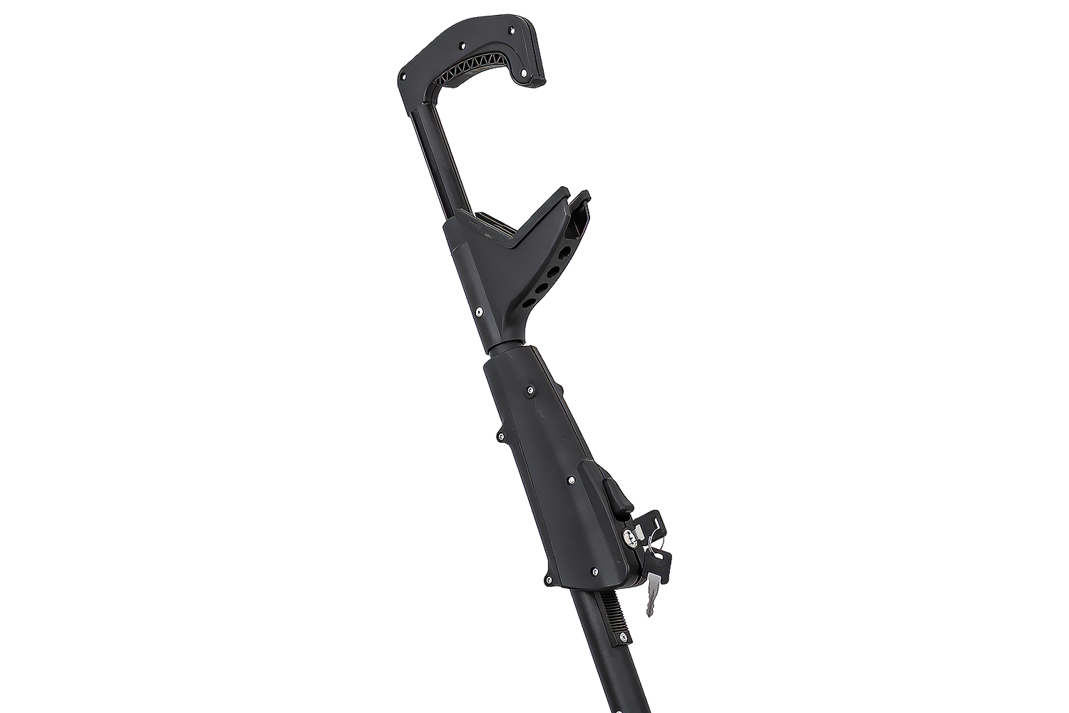 Kolo je zajištěno univerzální pogumovanou svorkou , která bezpečně uchopí rám a zároveň jej chrání před poškrábáním. Držák je kompatibilní s rámy o průměru 22–80 mm , takže je kompatibilní s širokou škálou typů kol, včetně modelů se silnějšími nebo nestandardními rámy. Konstrukce umožňuje montáž držáku na levou nebo pravou stranu vozu – stačí jednoduše změnit polohu ramene a podpěr kol.