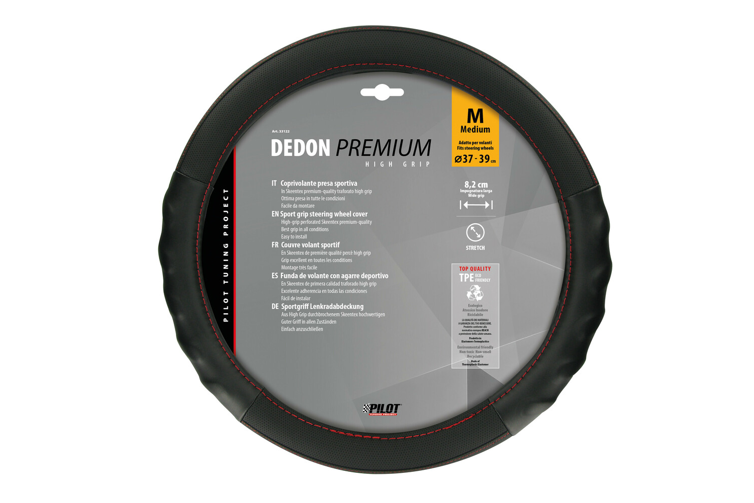 - Potah volantu Dedon Skeentex ve velikosti M (37–39 cm) je vhodný pro většinu osobních automobilů a menších dodávek. Je vyroben z měkkého Skeentexu, který poskytuje bezpečný, ergonomický úchop a vysoký jízdní komfort. Snadno se instaluje a je odolný.