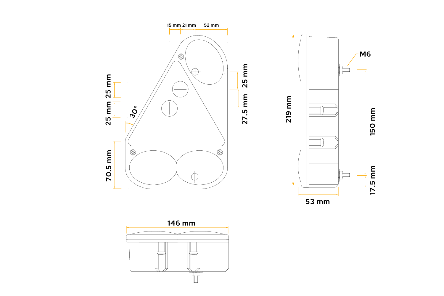 Sada dvou zadních světel EARPOINT III od firmy ASPÖCK, určená pro montáž na levou a pravou stranu vozidla , má rozměry 146 mm na šířku , 219 mm na výšku a 53 mm na hloubku . Obě světla jsou vybavena 5pinovými bajonetovými konektory pro rychlou a snadnou instalaci. v přívěsech, autobusech nebo návěsech .
