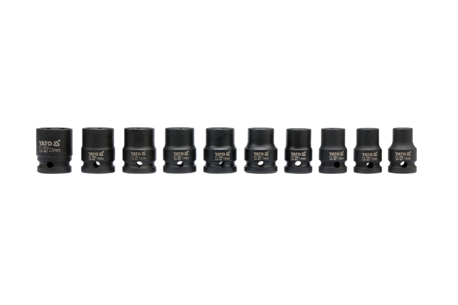 - Sada rázových nástrčných klíčů YT-1025 obsahuje 10 krátkých 1/2" nástrčných klíčů vyrobených z odolné oceli. Šestihranný profil a systém AS-DRIVE zajišťují bezpečné uchopení a přenos krouticího momentu. Ideální pro práci s rázovými utahováky v dílně a gar
