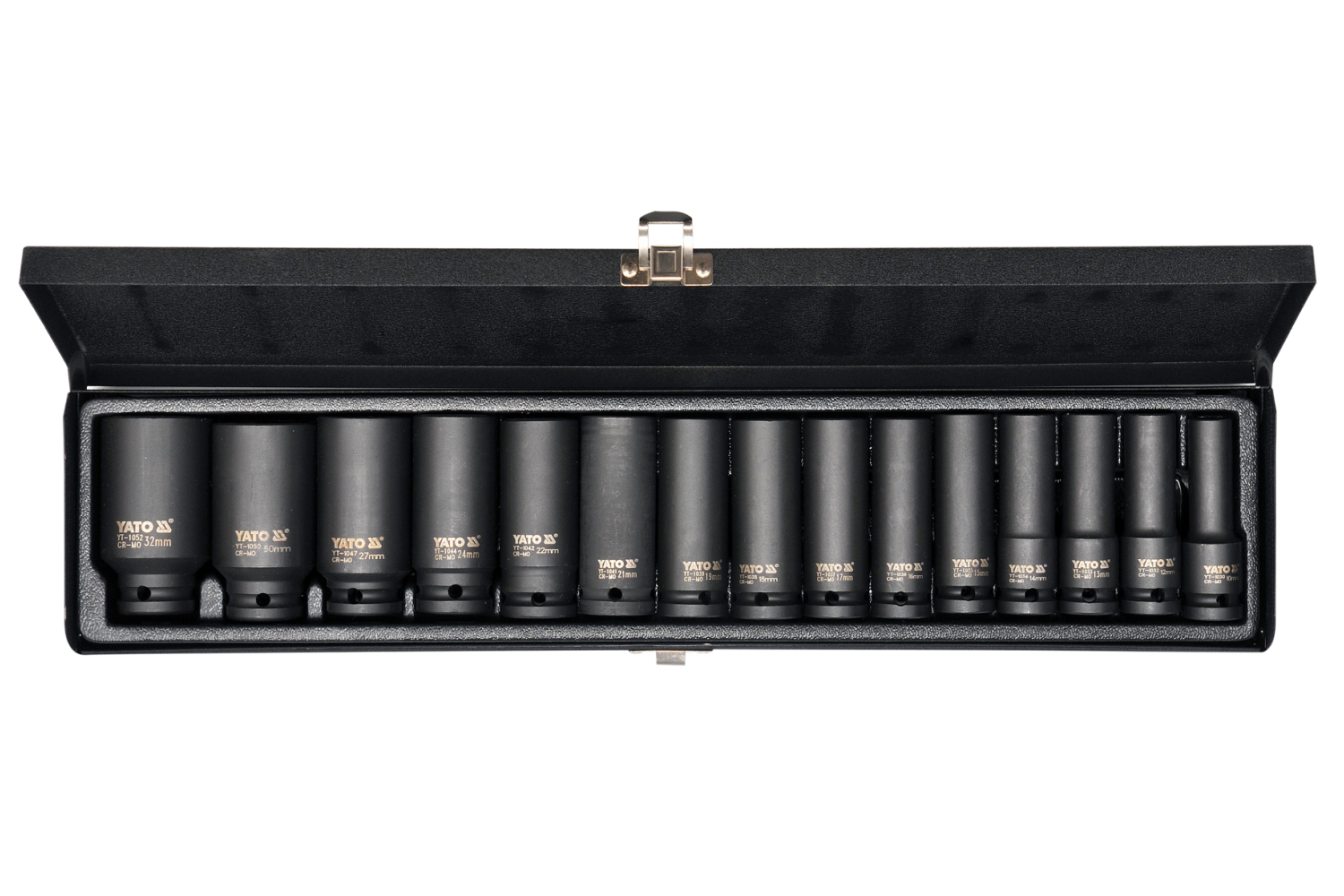 - Sada rázových nástrčných klíčů YT-1055 obsahuje 15 dlouhých 1/2" nástrčných klíčů vyrobených z odolné oceli. Šestihranný profil a systém AS-DRIVE zajišťují bezpečné uchopení a přenos krouticího momentu. Ideální pro práci s rázovými utahováky v dílně a gar
