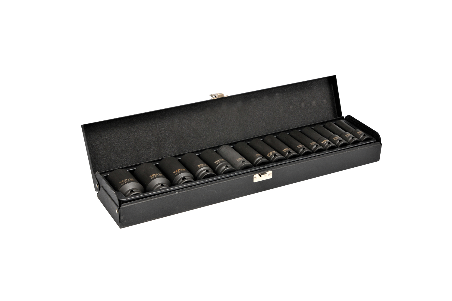- Sada rázových nástrčných klíčů YT-1055 obsahuje 15 dlouhých 1/2" nástrčných klíčů vyrobených z odolné oceli. Šestihranný profil a systém AS-DRIVE zajišťují bezpečné uchopení a přenos krouticího momentu. Ideální pro práci s rázovými utahováky v dílně a gar
