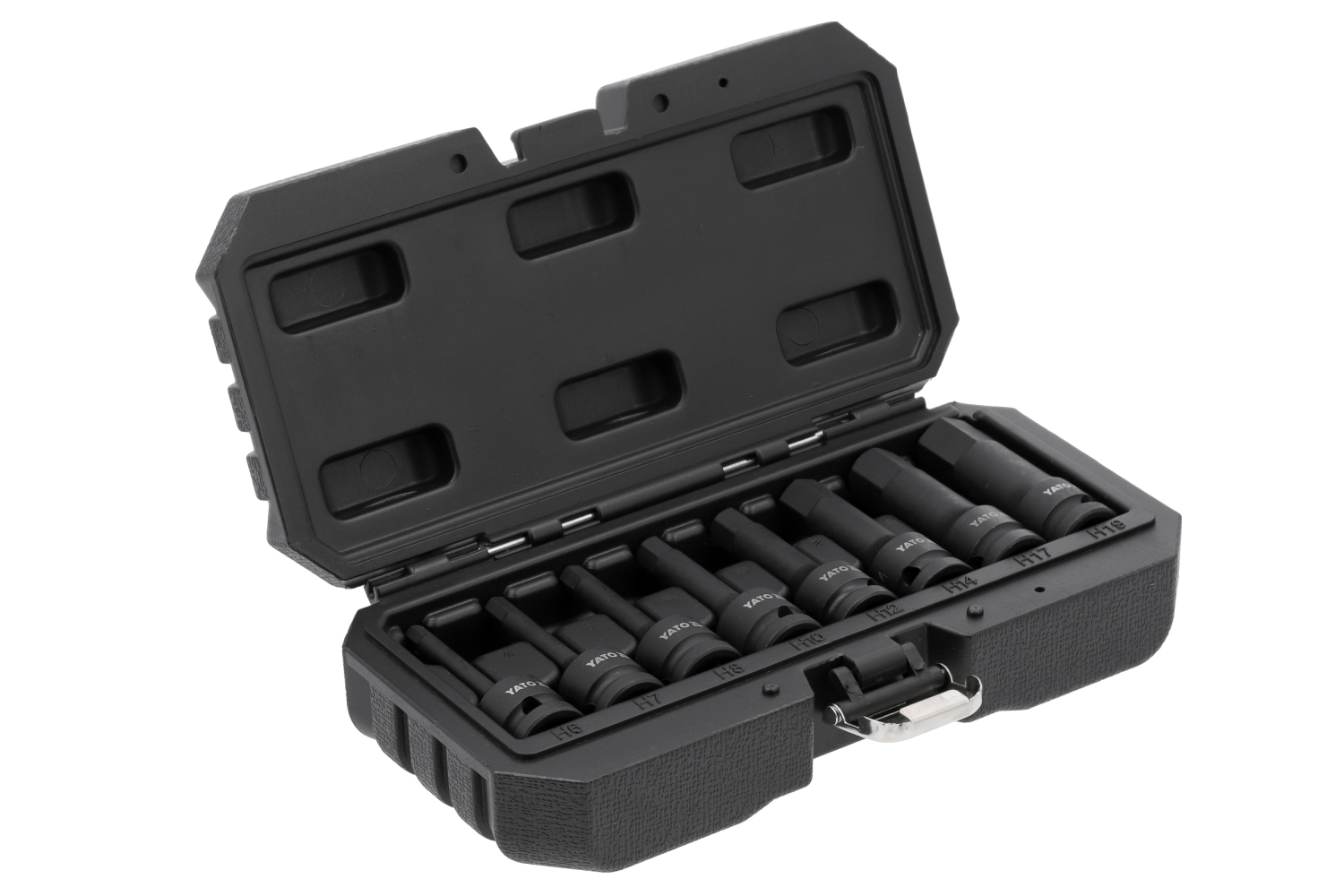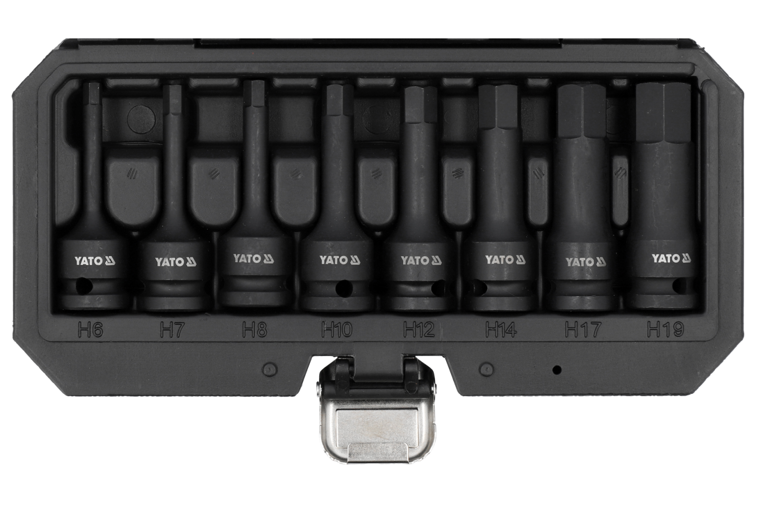 - Osm impaktních šestihranných hlavic YT-1066, ideálních pro náročné práce. Jejich dlouhá konstrukce usnadňuje přístup k hluboko usazeným šroubům, díky čemuž jsou vhodné pro automobilové a průmyslové aplikace. Jsou ideální pro opravy hlav válců, nábojů a hn