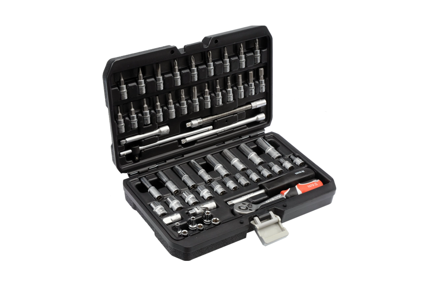 Sada nářadí YT-14501 od YATO je rozsáhlá sada 56 kusů o velikosti 1/4" , určená pro přesnou montáž a servisní práce. Je ideální pro autoservisy, mechanické dílny a domácí garáže. Nástrčné klíče a pohon jsou vyrobeny z vysoce kvalitní chrom-vanadové oceli CrV 50BV30 a ráčna je vybavena 72zubým mechanismem, který umožňuje práci ve stísněných prostorech díky pracovnímu zdvihu 5°. Nástrčné klíče jsou kované v zápustce a přesně kalibrované, což zaručuje perfektní uchycení šroubů a vysokou odolnost.