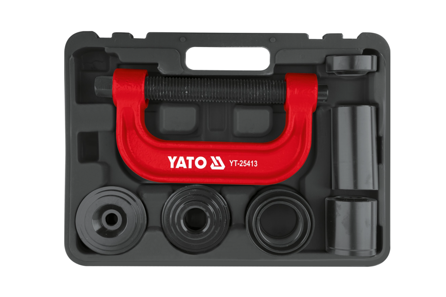 - Šroubový lis YT-25413 umožňuje rychlé a přesné vyjímání a montáž čepů a pouzder bez nutnosti demontáže nosníku ramene řízení. Jeho pracovní rozsah 130 mm a odolná ocelová konstrukce zajišťují spolehlivost. Je vhodný pro profesionální dílny a usnadňuje prá