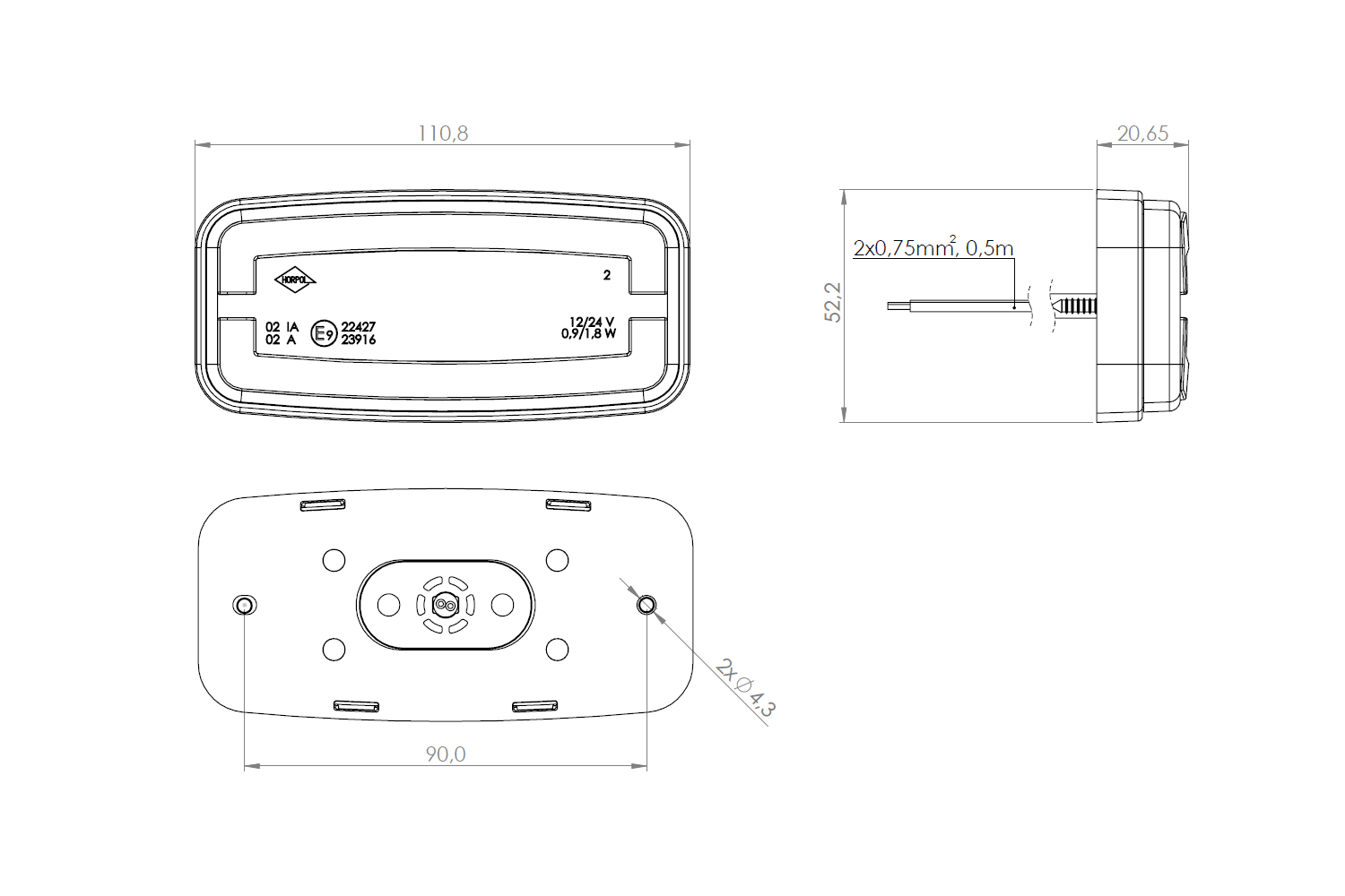 LED obrysové světlo LD 2761 od společnosti HORPOL, určené pro montáž na levou i pravou stranu vozidla , měří 110,8 mm na šířku, 52,2 mm na výšku a 20,65 mm do hloubky . Je navrženo pro provoz v rozsahu napětí 12–24 V a je vhodné pro použití na přívěsech, zemědělských strojích, nákladních automobilech a odtahovkách, což zdůrazňuje jeho všestrannost. Je vybaveno plochým kabelem o délce 0,5 m , což umožňuje rychlou a snadnou instalaci. Díky LED technologii poskytuje světlo vysoký výkon, odolnost a energetickou účinnost, což zajišťuje bezpečnost v různých silničních podmínkách. Těleso světla umožňuje instalaci bez viditelných upevňovacích prvků.