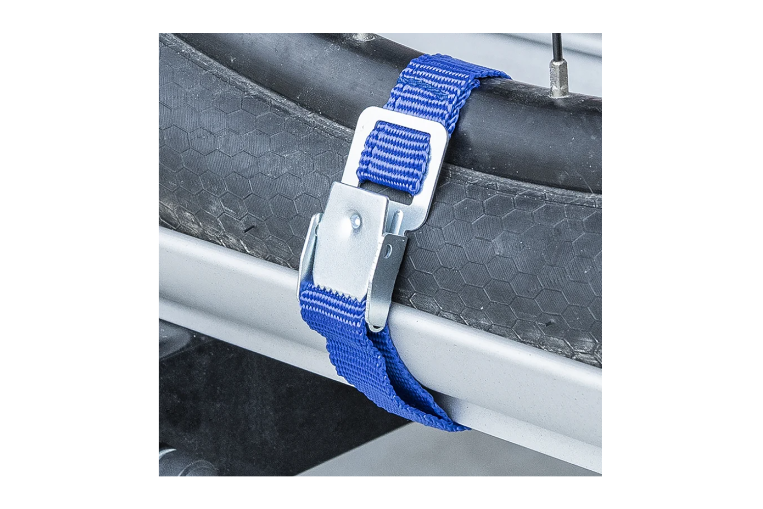 Popruhy k upevnění kol na nosič kol se samosvornou kovovou přezkou – 4 ks. Tato praktická sada je určena pro bezpečné upevnění kol jízdních kol k nosičům kol. Popruhy bezpečně drží kola v kolejnicích nosiče a zabraňují jejich posunutí během jízdy. Pevná konstrukce a odolný kovový zámek zajišťují bezpečné a stabilní upevnění kola během přepravy.
