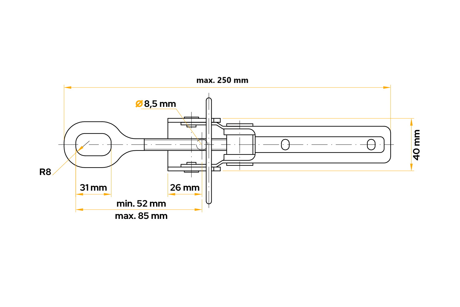 Excentrické boční tažné zařízení BV 40-1 od společnosti WINTERHOFF je robustní součást kování pro přívěsy určená k bezpečnému a trvalému zajištění boků nákladních, zemědělských a užitkových přívěsů. Tažné zařízení je dlouhé 250 mm a má nosnost až 1100 kg , což zajišťuje jeho odolnost i při náročném používání . Tažné zařízení je vybaveno pojistkou proti náhodnému otevření a flexibilní plastová šňůra zabraňuje ztrátě, což zajišťuje pohodlí a bezpečnost.