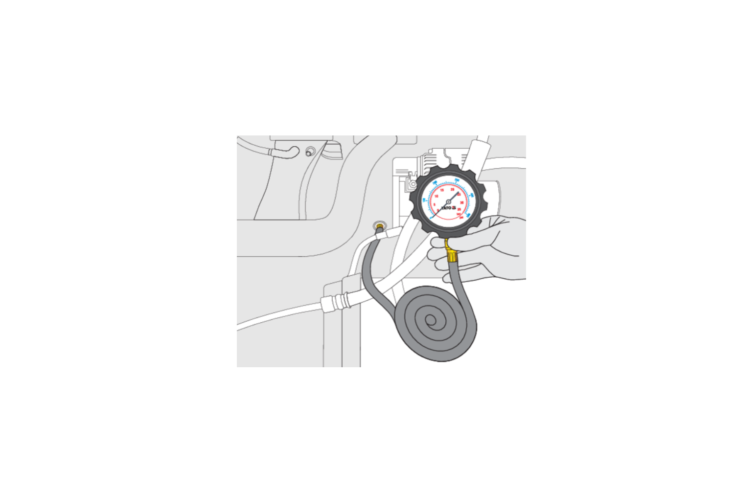 Sada je vybavena snadno čitelným manometrem o průměru 70 mm , který je chráněn gumovým krytem pro zvýšenou odolnost proti poškození. Dlouhá hadice (125 cm) usnadňuje práci na těžko dostupných místech a zajišťuje pohodlné používání.