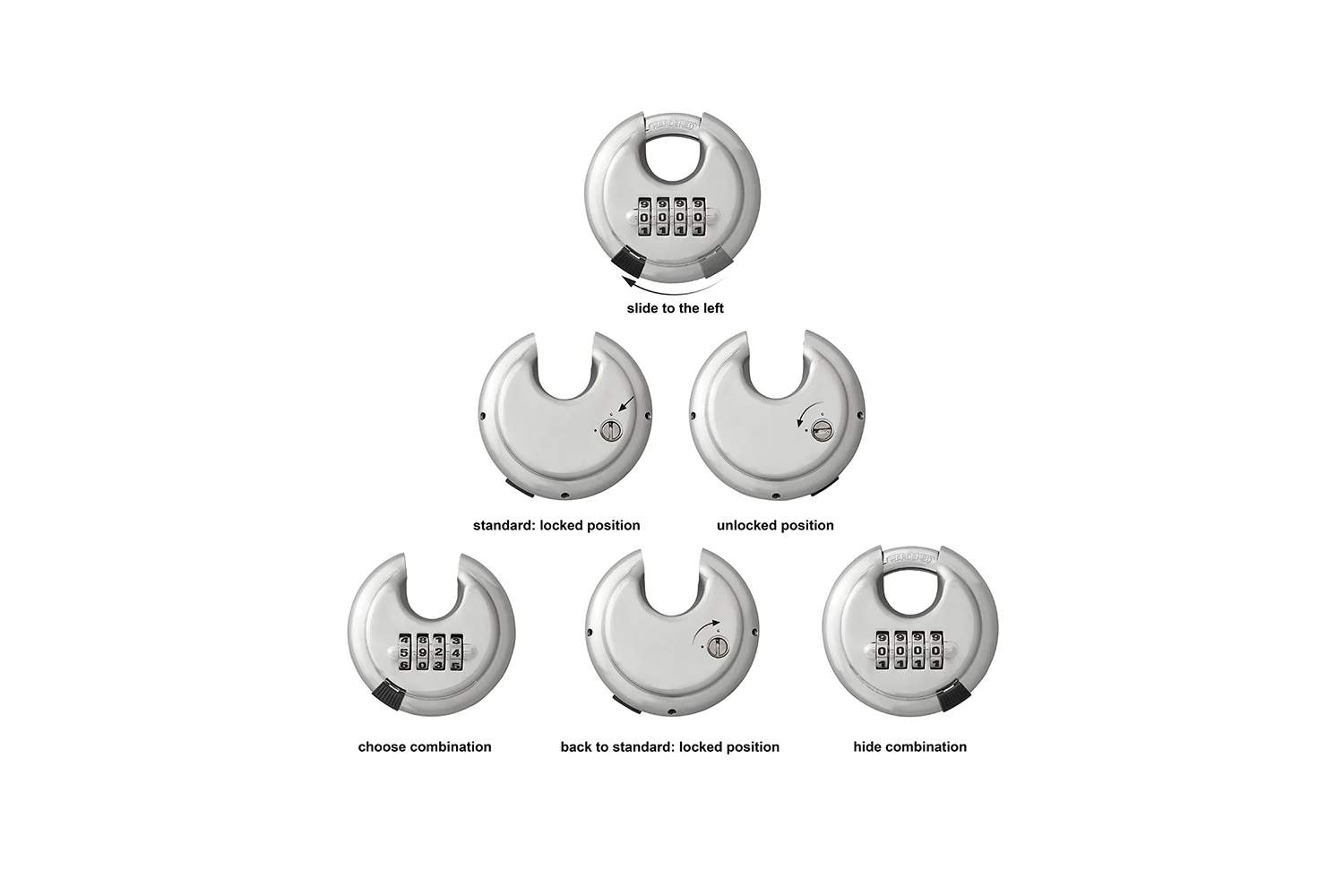 Visací zámek je vyroben z odolné, vyztužené oceli. Je vybaven kaleným třmenem o průměru 10 mm a čtyřmístnou kombinací , která vám umožňuje nastavit si vlastní kombinaci. Díky tomu odpadá potřeba klíče, což je obzvláště výhodné, když jeden zámek sdílí více lidí.