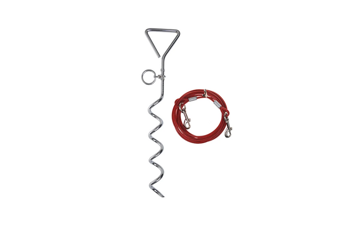 Sada obsahuje spirálový zemní kolík a 4,5metrové ocelové lano . Kůl je vyroben z odolné oceli a díky svému spirálovému tvaru jej lze pevně zapustit do země bez nutnosti použití speciálního nářadí. Horní otočný kroužek pomáhá zabránit zamotání lanka při pohybu psa.