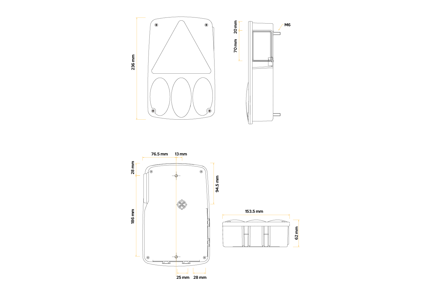 Zadní svítilna Earpoint IV od ASPÖCK je určena pro montáž na pravou stranu vozidla a má tyto rozměry: šířka 153,5 mm, výška 236 mm, hloubka 62 mm . Je vybaven 5pinovým bajonetovým konektorem a umožňuje snadnou a rychlou instalaci v přívěsech, autobusech a odtahových vozech .