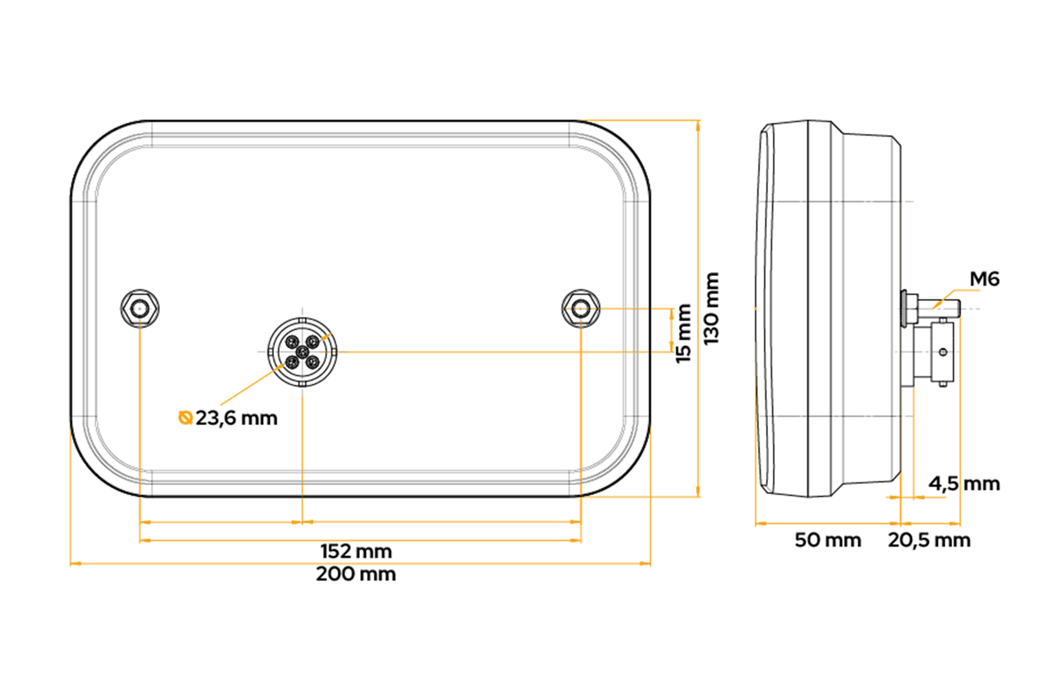 Zadní LED svítilna FT-270 od FRISTOM, určená pro montáž na pravou stranu vozidla , se vyznačuje následujícími rozměry: šířka 200 mm, výška 130 mm, hloubka 50 mm . Je navržen pro provoz v rozsahu napětí 12 V , lze jej použít v lehkých přívěsech, autobusech a přívěsech, což podtrhuje jeho univerzálnost. Je vybavena 5pinovým bajonetovým konektorem , což umožňuje snadnou a rychlou instalaci. Díky použití LED technologie poskytuje svítilna vysoký výkon, odolnost a energetickou účinnost, což zajišťuje bezpečnost v různých silničních podmínkách. Konstrukce svítidla je hermetická , odolná proti nárazům a mechanickému poškození a má také elektrickou ochranu proti přepólování, což navíc zvyšuje její spolehlivost v náročných provozních podmínkách .