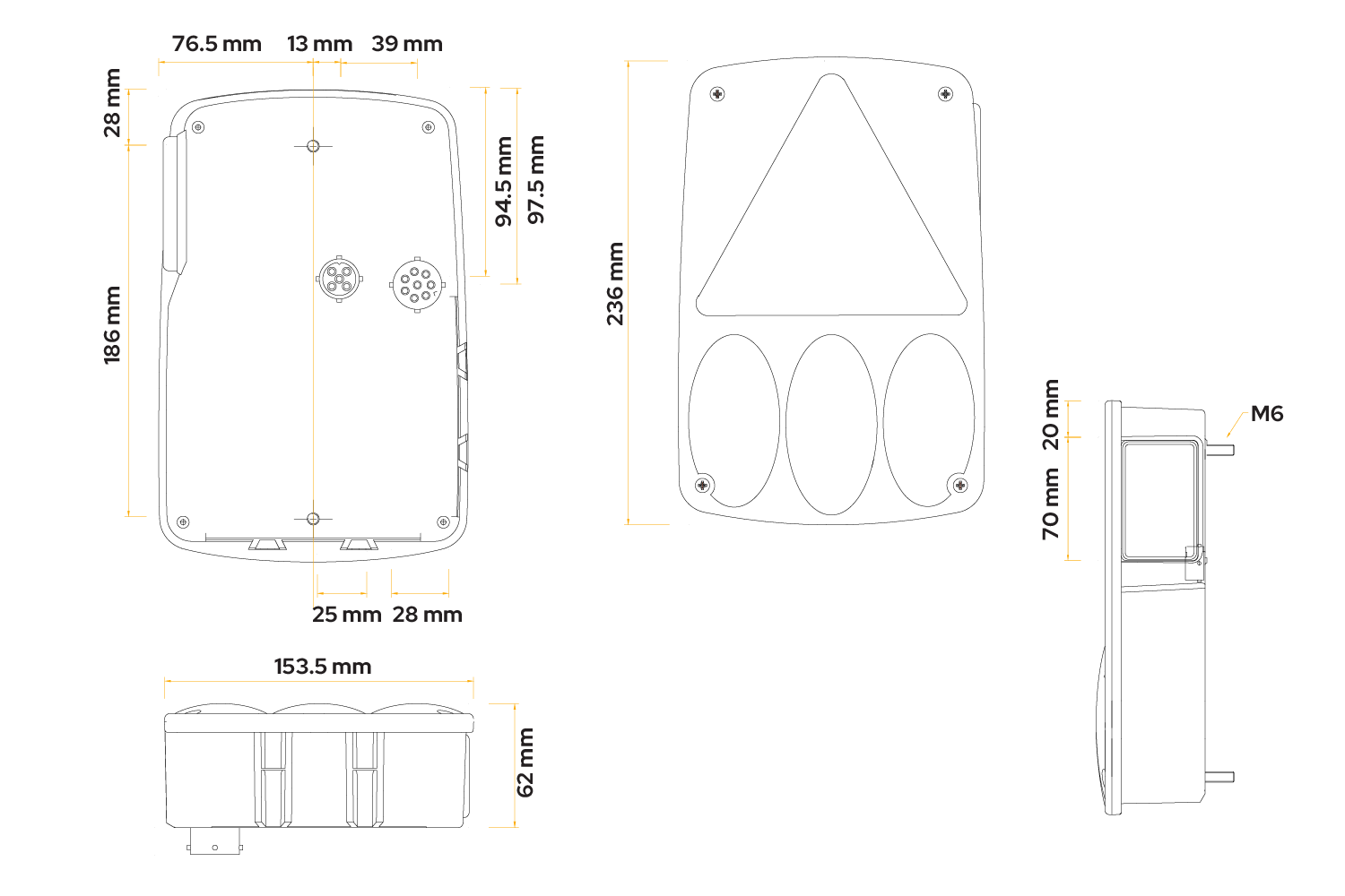 Zadní svítilna Earpoint IV od ASPÖCK je určena pro montáž na levou stranu vozidla a má následující rozměry: šířka 153,5 mm, výška 236 mm, hloubka 62 mm . Vybaveno 5pinovými a 8pinovými bajonetovými konektory , umožňuje snadnou a rychlou instalaci v přívěsech, autobusech a odtahových vozech .