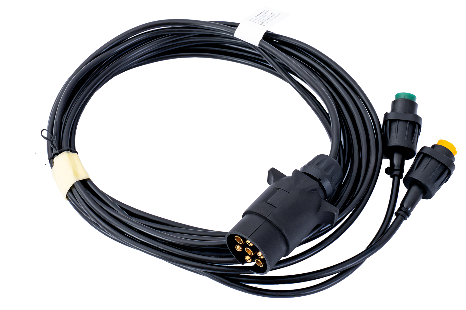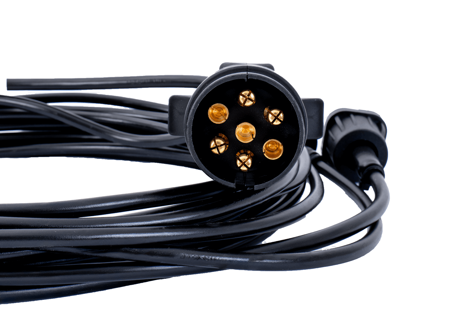 Kabeláž je vybavena dvěma 5pinovými bajonetovými konektory pro připojení zadních světel. Bajonetový systém zajišťuje rychlou a bezpečnou instalaci a eliminuje riziko náhodného odpojení během jízdy. Konstrukce konektoru zaručuje vodotěsné spojení a chrání kontakty před korozí, čímž zajišťuje dlouhodobý a bezproblémový provoz celého systému osvětlení přívěsu.