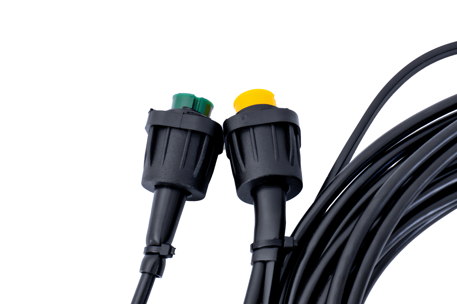 Kabeláž je vybavena dvěma 5pinovými bajonetovými konektory pro připojení zadních světel. Bajonetový systém zajišťuje rychlou a bezpečnou instalaci a eliminuje riziko náhodného odpojení během jízdy. Konstrukce konektoru zaručuje vodotěsné spojení a chrání kontakty před korozí, čímž zajišťuje dlouhodobý a bezproblémový provoz celého systému osvětlení přívěsu.