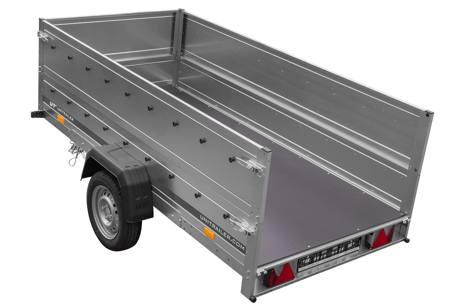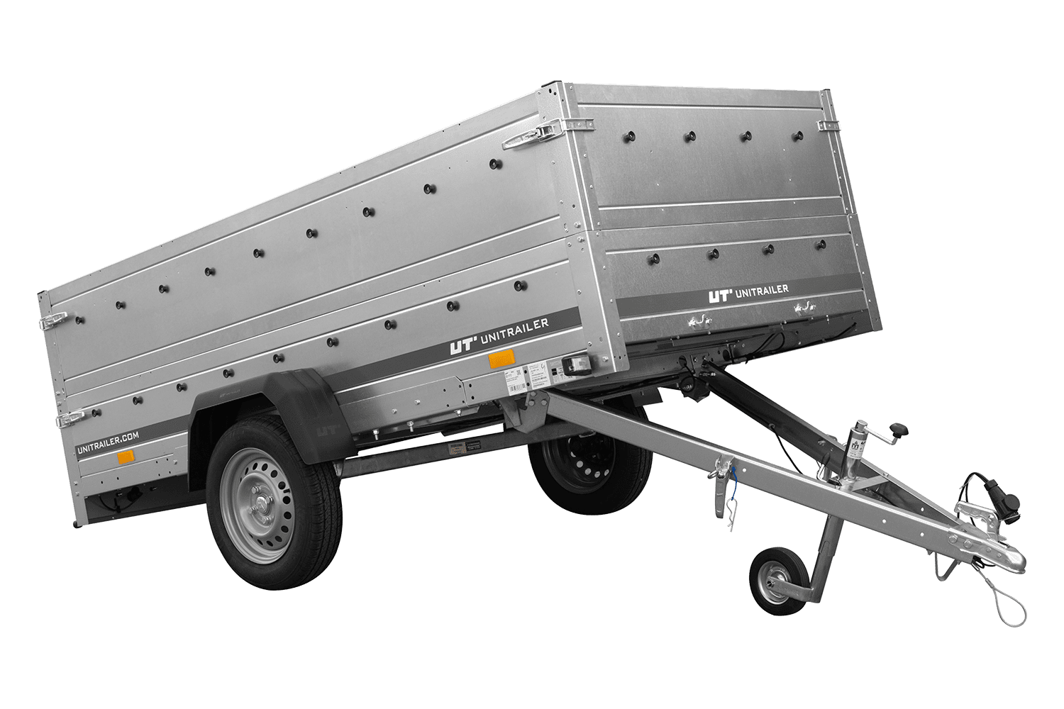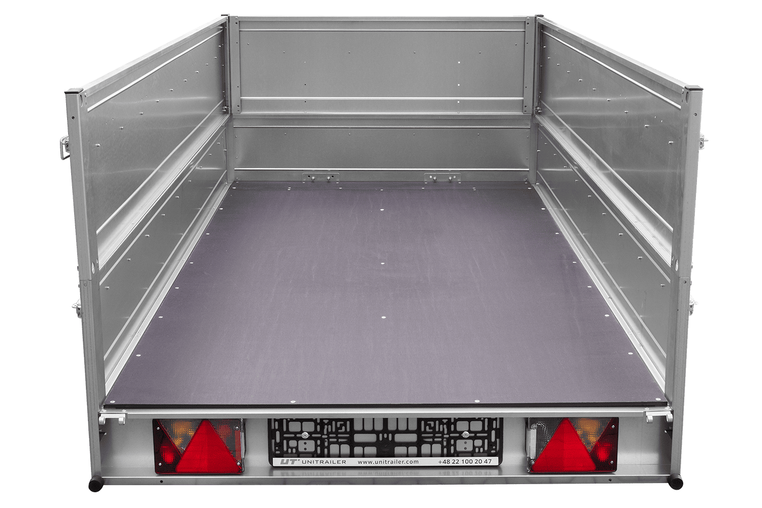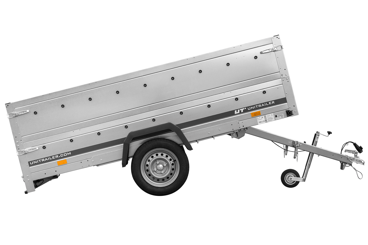 - Velký přívěs se sklopnou ojí a bočnicemi o celkové výšce 70 cm. Největší přívěs s CPH od 300 do 750 kg.