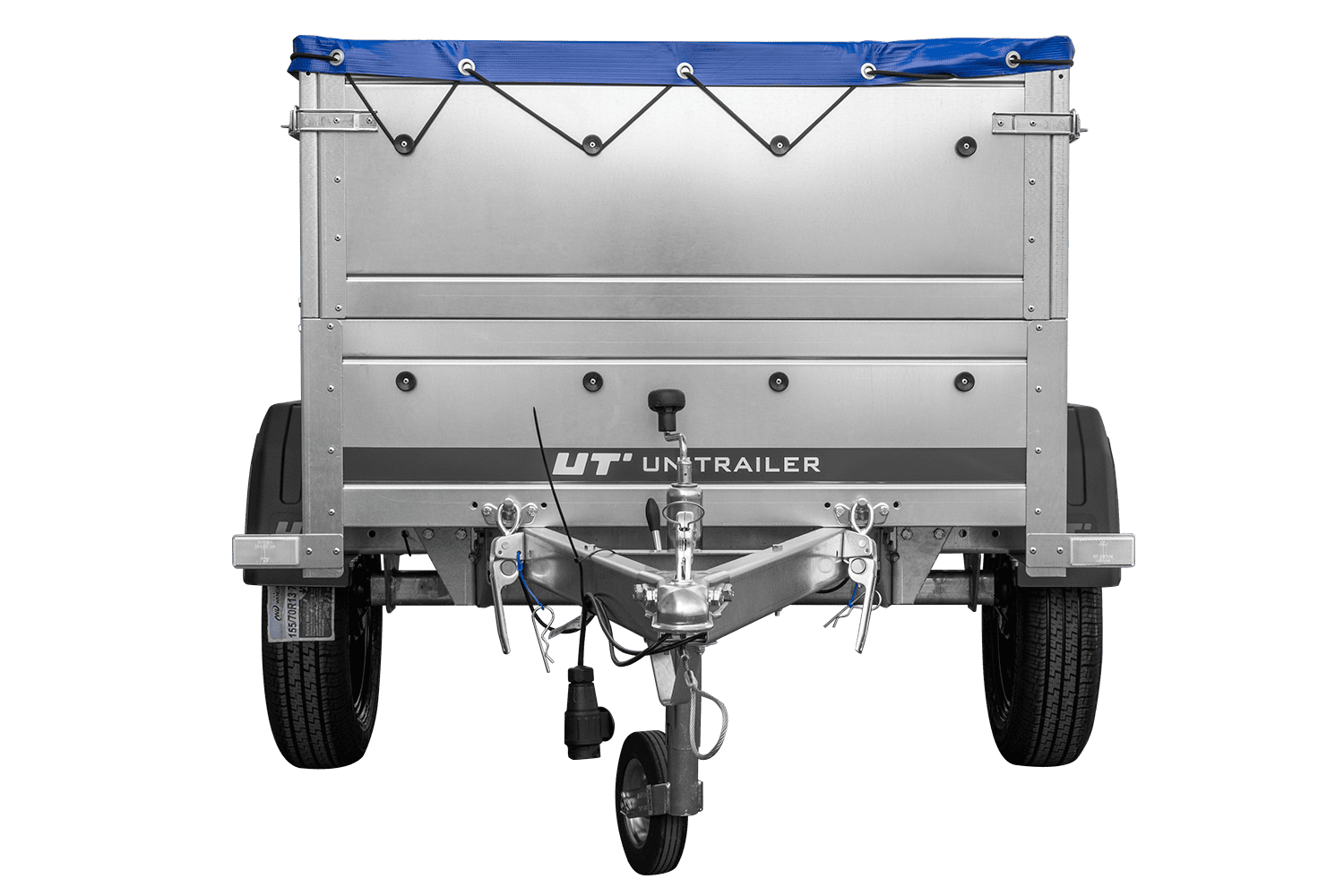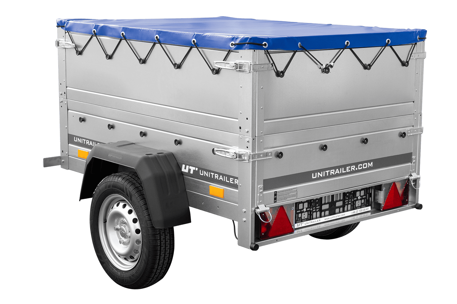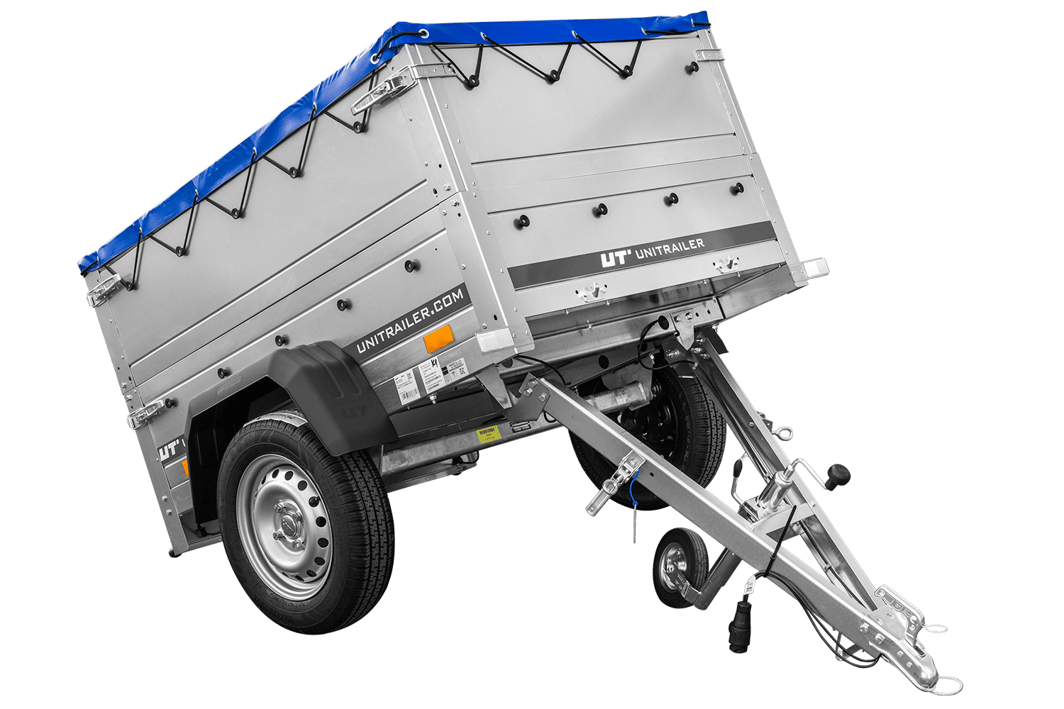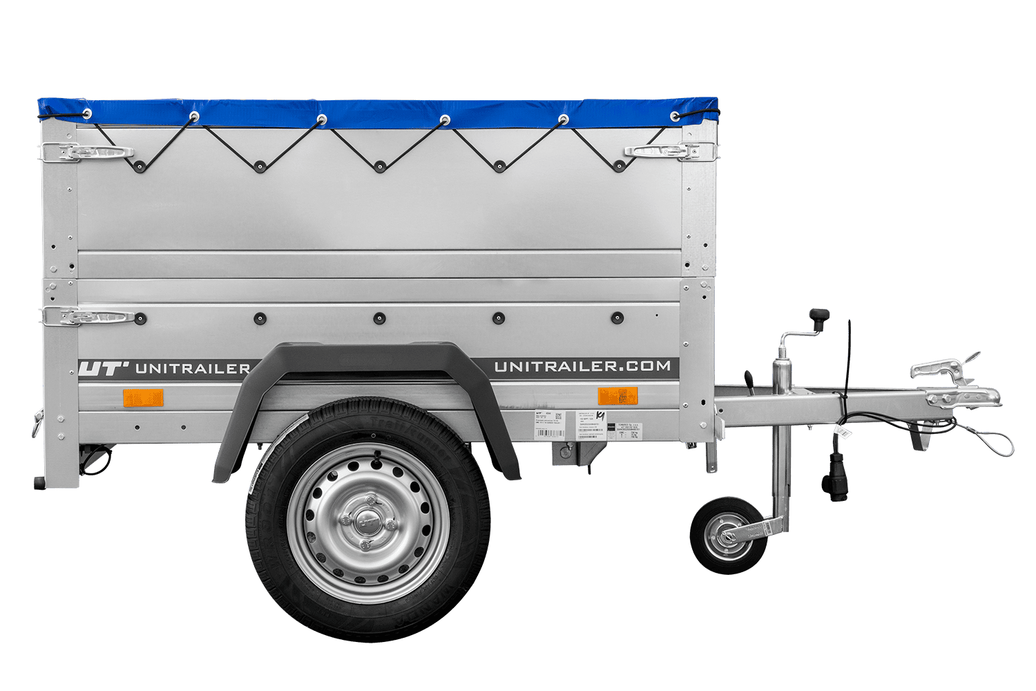 Jednonápravový přívěs UNITRAILER Garden Trailer 150 KIPP s opěrným kolečkem, bočnicemi BIS a modrou plachtou. Díky tomu, že je CPH od 300 do 750 kg může být taženo běžným autem s řidičským průkazem skupiny B.