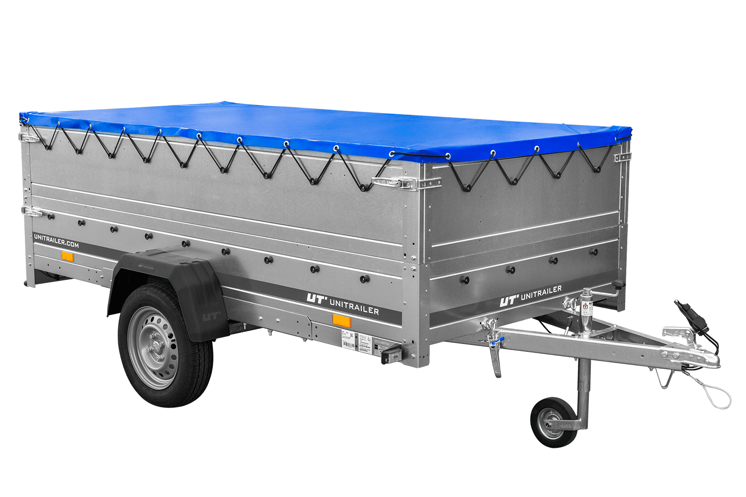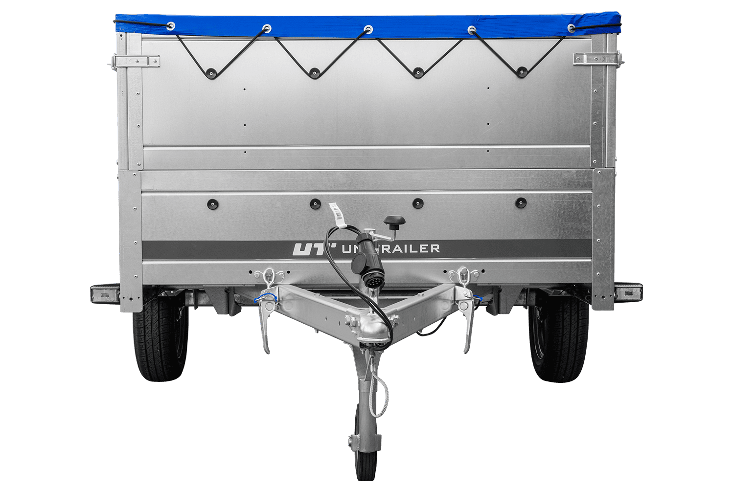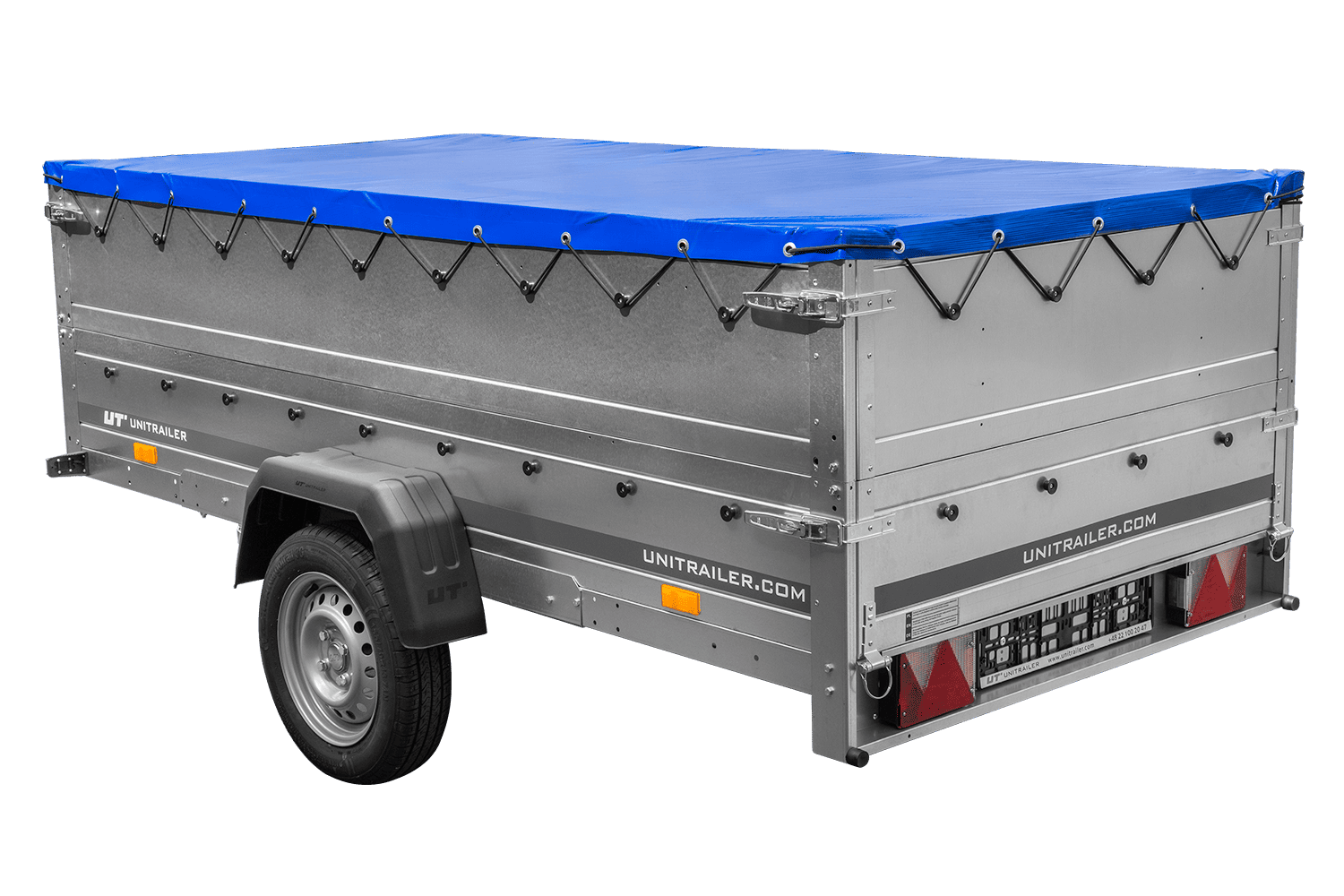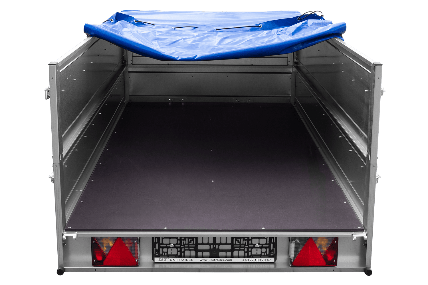 - Jednonápravový přívěs s dvojitými stranami a plochou plachtou. Navíc má přívěs opěrné kolo, 40 cm vysoké bočnice BIS a modrý plochý kryt.