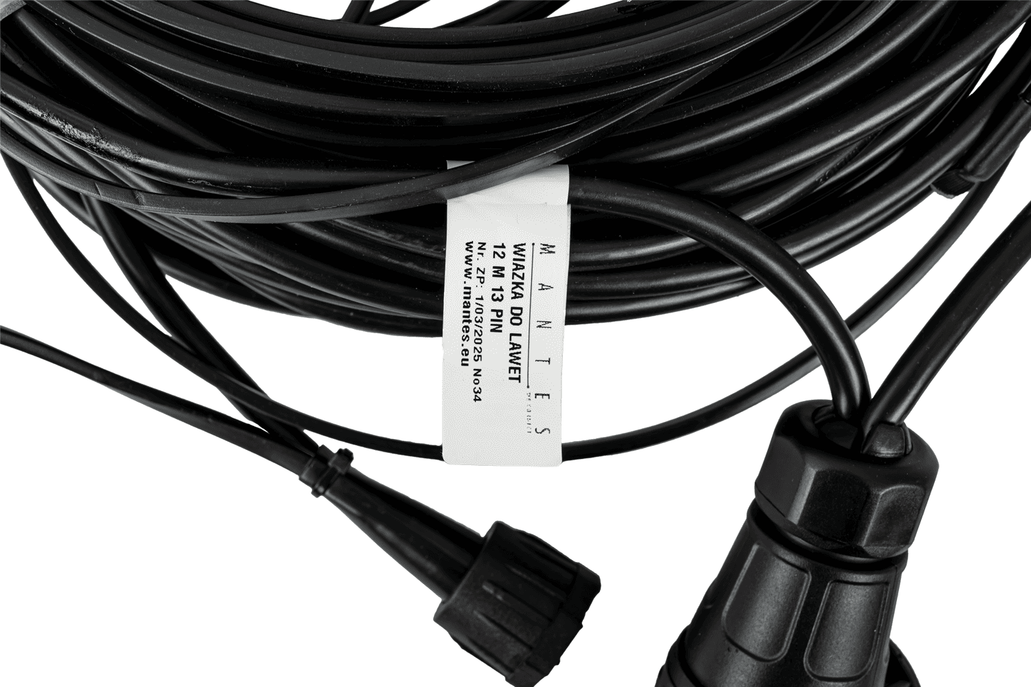 - Elektroinstalace MANTES vybavená 12 m hlavním kabelem zakončeným zástrčkou 13 PIN. Kabelový svazek zajišťuje správnou funkci osvětlení v nákladních a valníkových přívěsech a 8-pinové bajonetové konektory umožňují rychlou a spolehlivou instalaci zadních sv