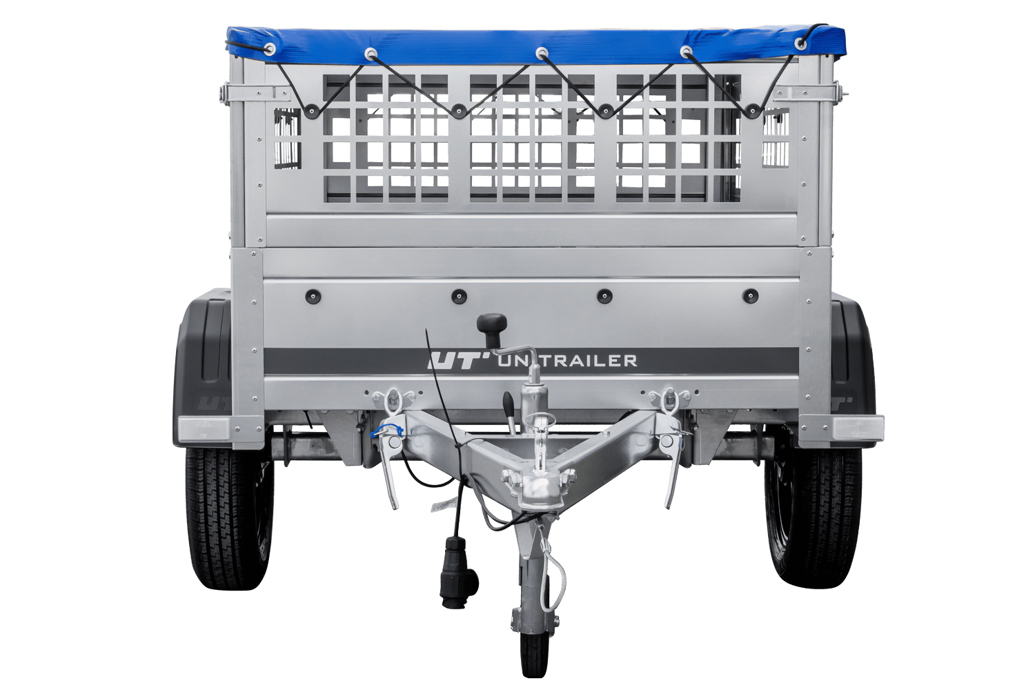 Přívěs Garden Trailer 150 KIPP s síťovanými bočnicemi a modrou plachtou