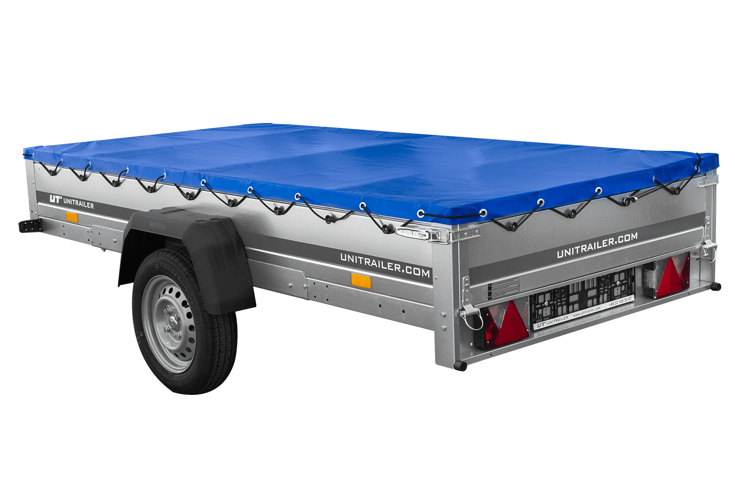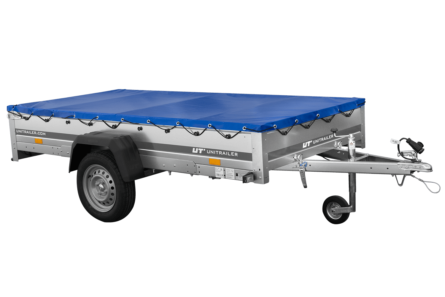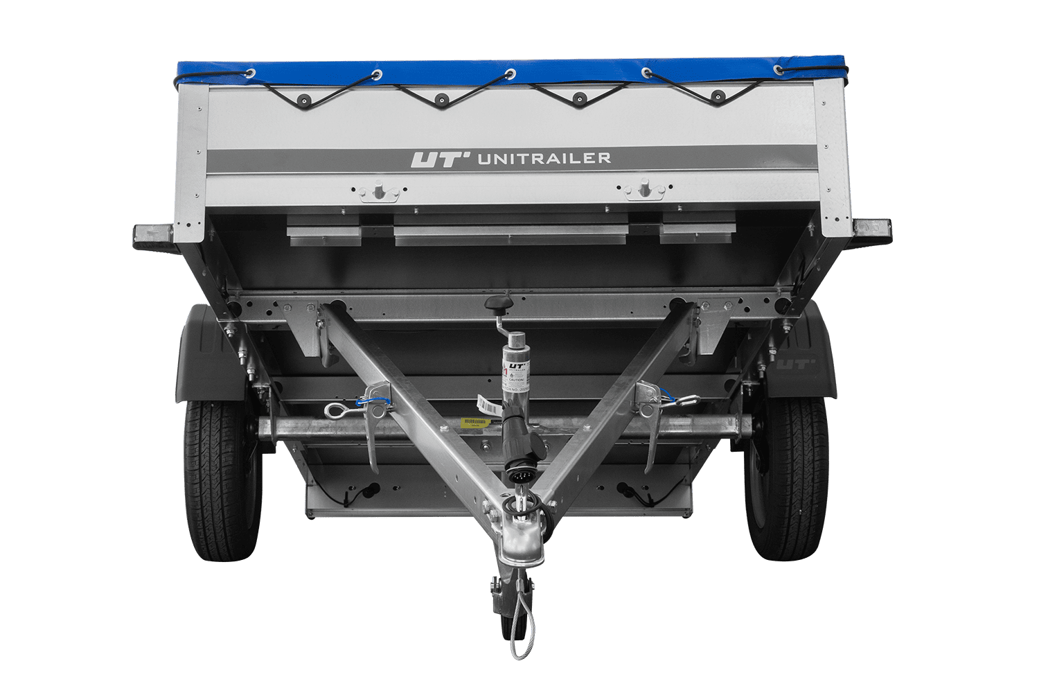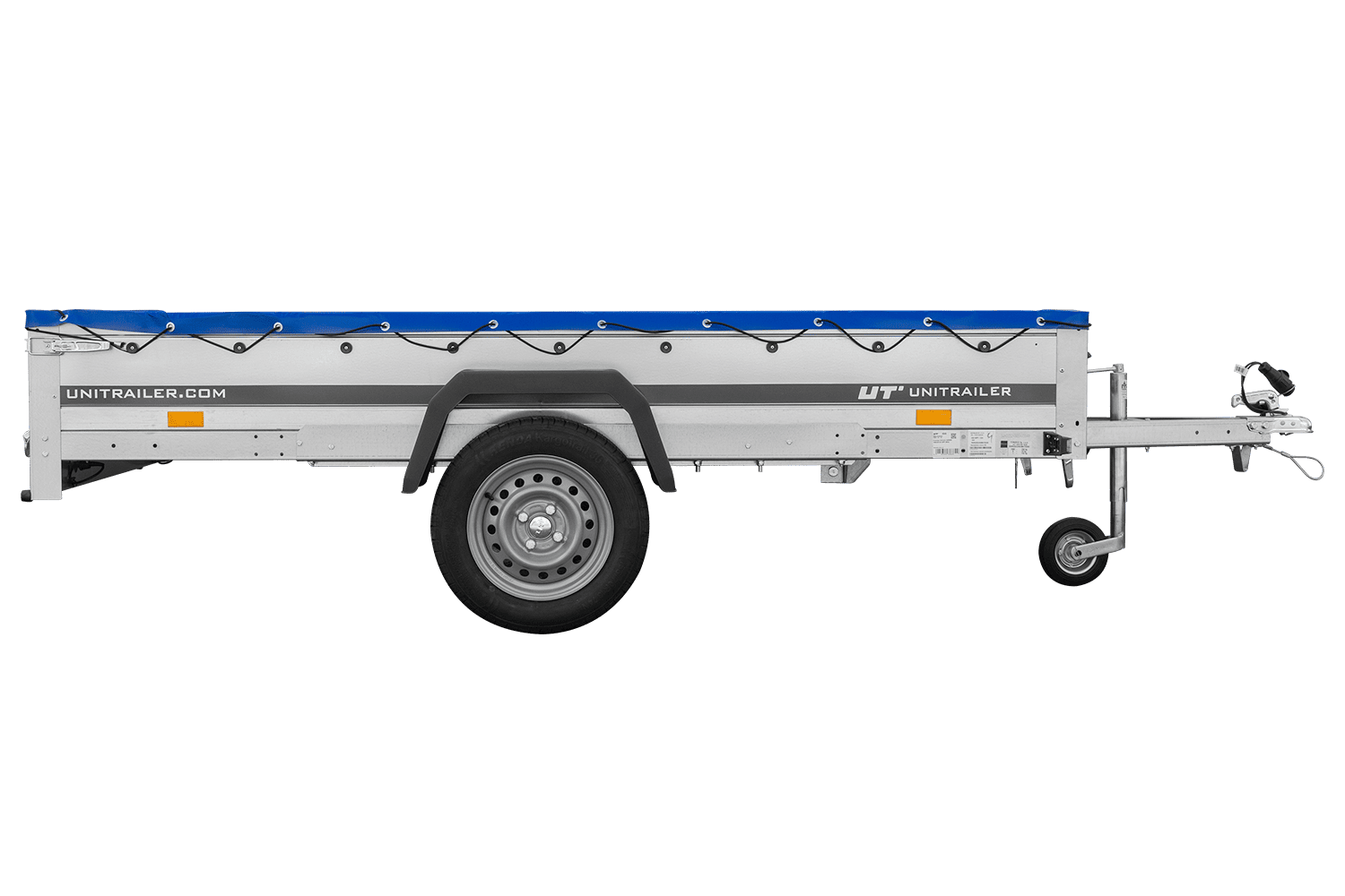 Jednonápravový přívěs Unitrailer GARDEN TRAILER 264 KIPP s opěrným kolem, plochým rámem H-0 a modrým krytem