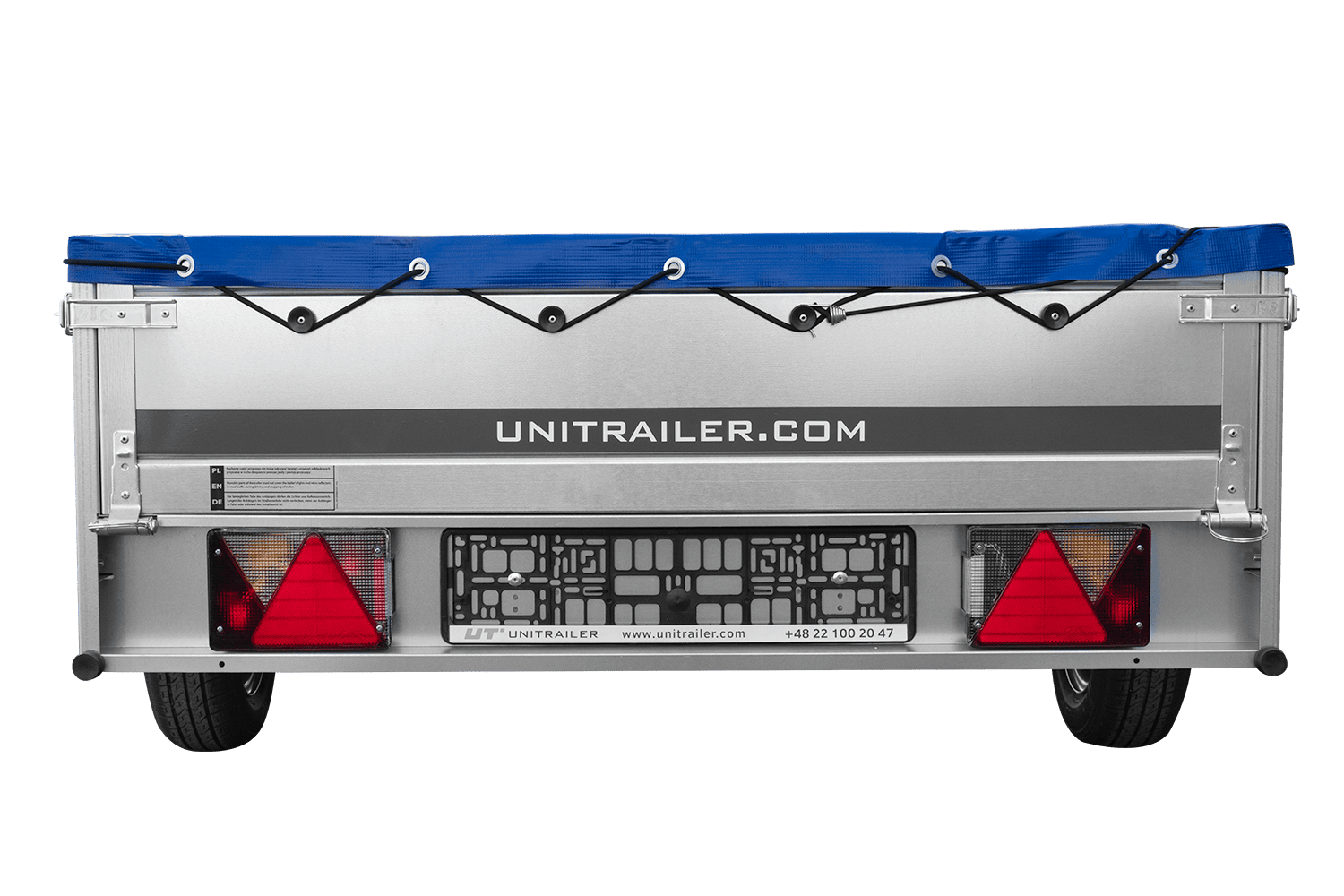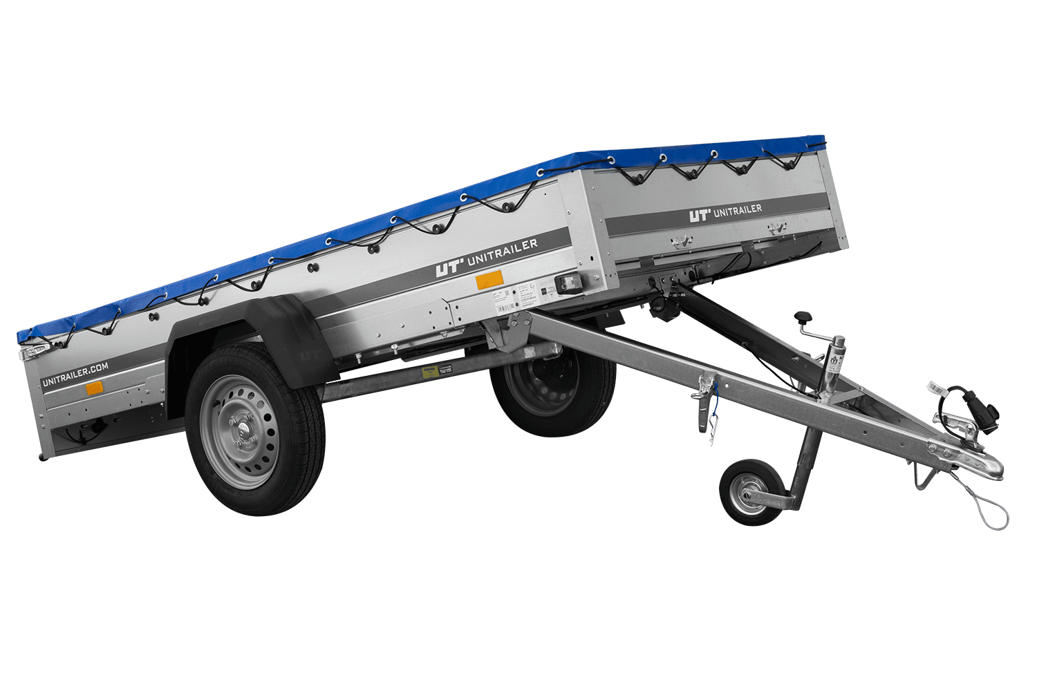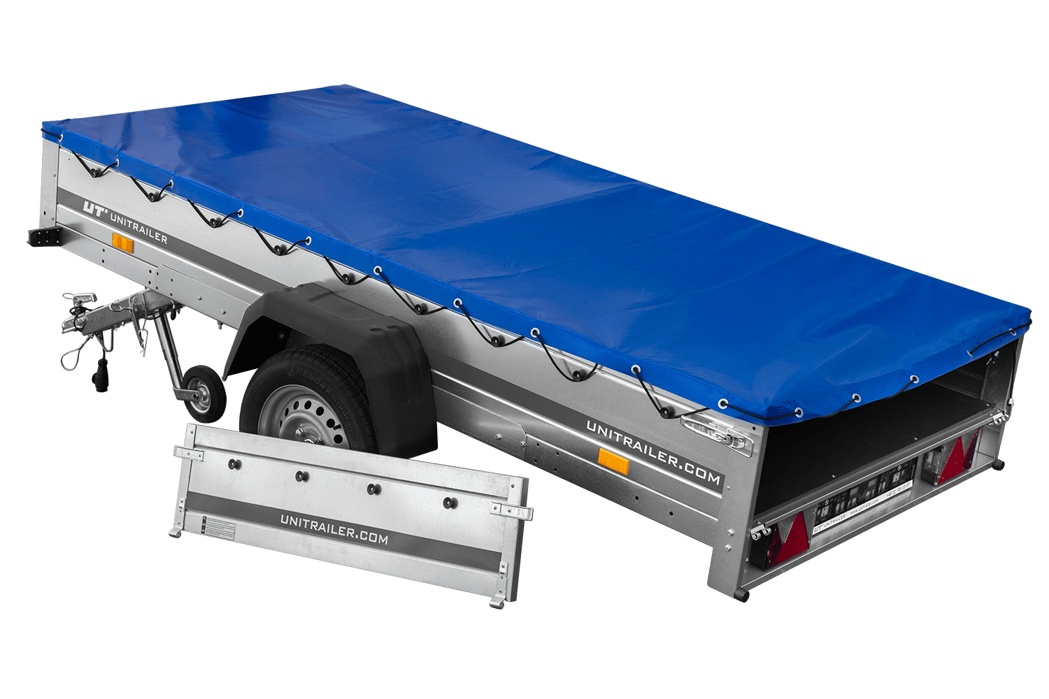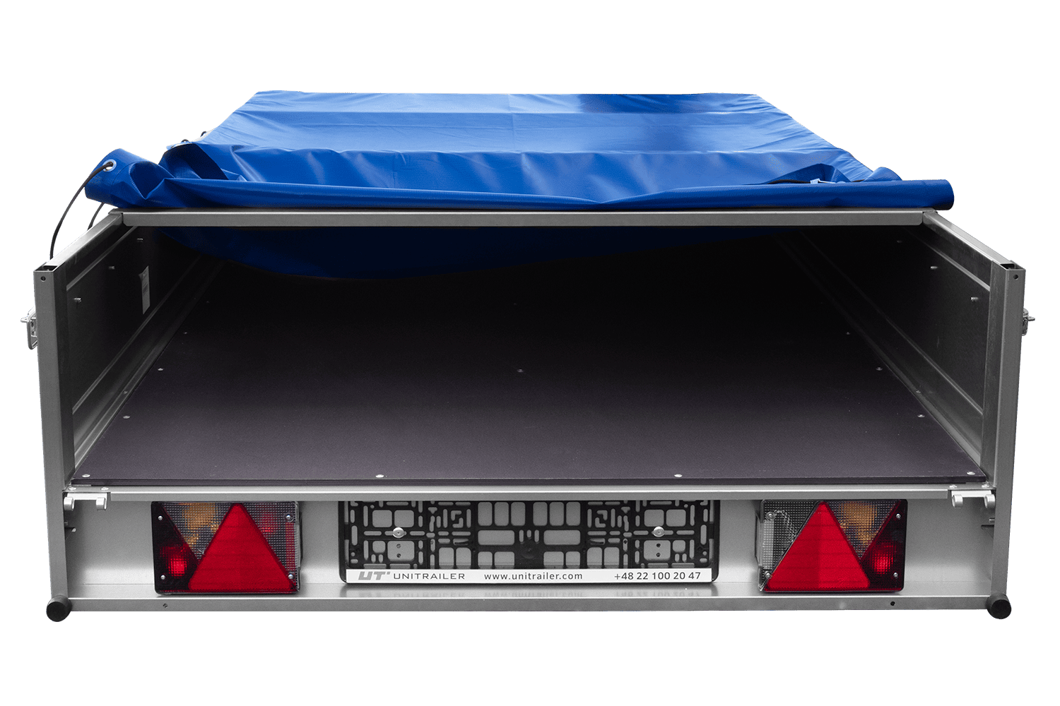 Jednonápravový přívěs Unitrailer GARDEN TRAILER 264 KIPP s opěrným kolem, plochým rámem H-0 a modrým krytem