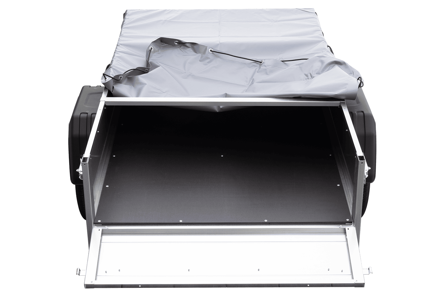 Lehký přívěs Garden Trailer 200 Kipp se sklopnou ojí, šedou plachtou s H-0 rámem a opěrným kolečkem