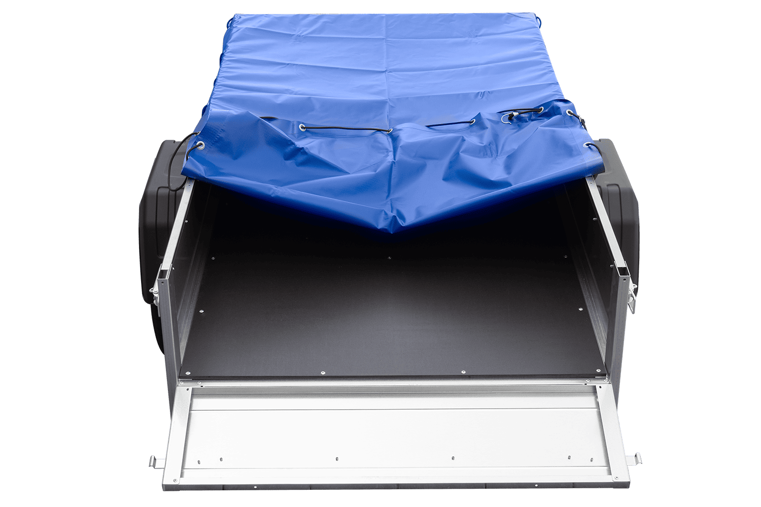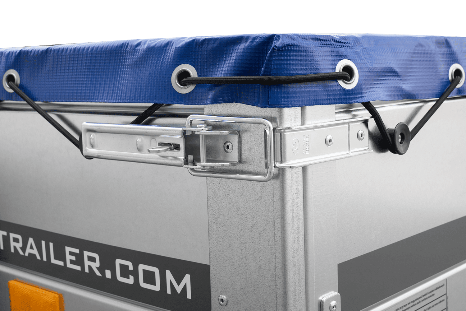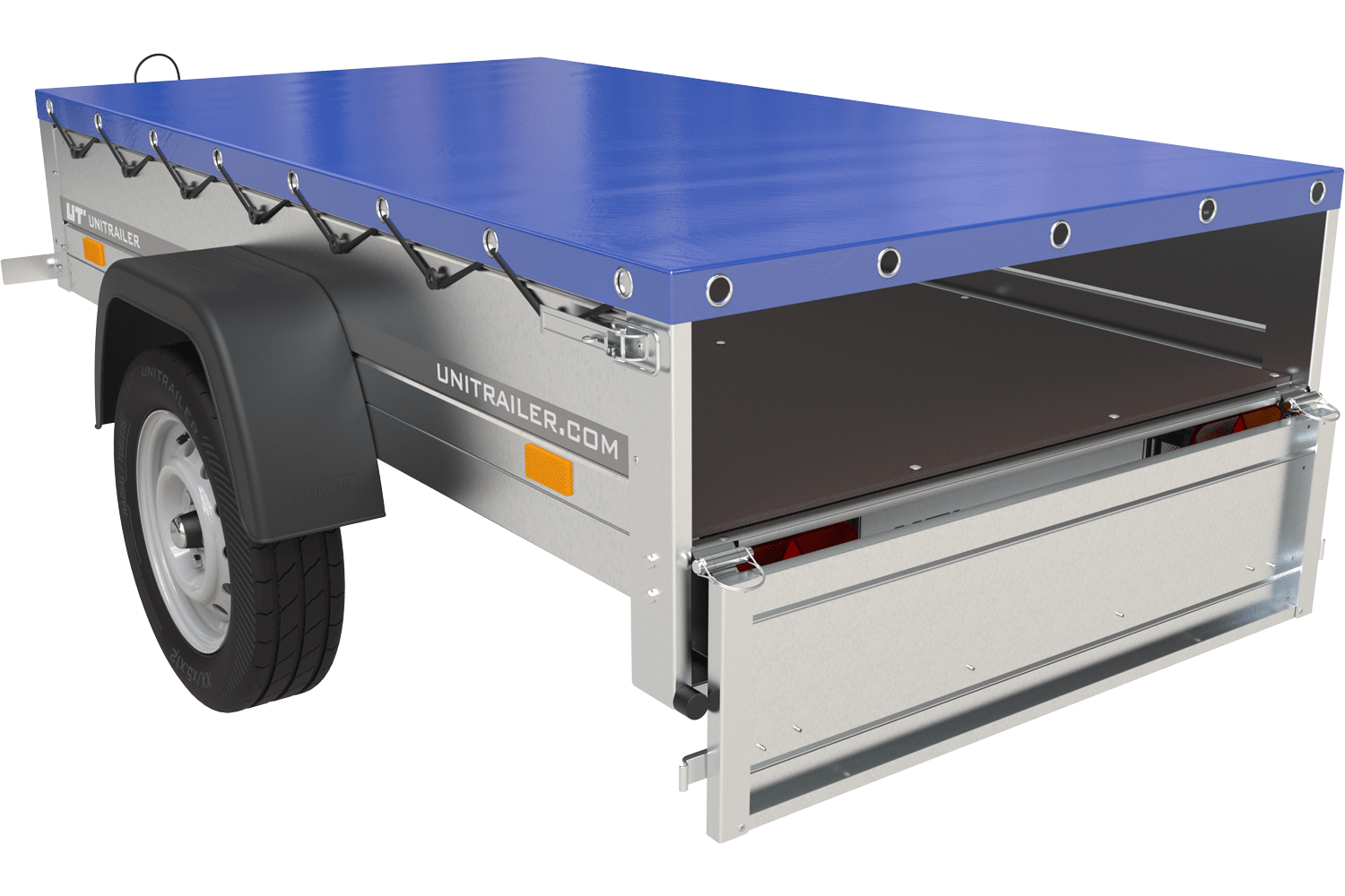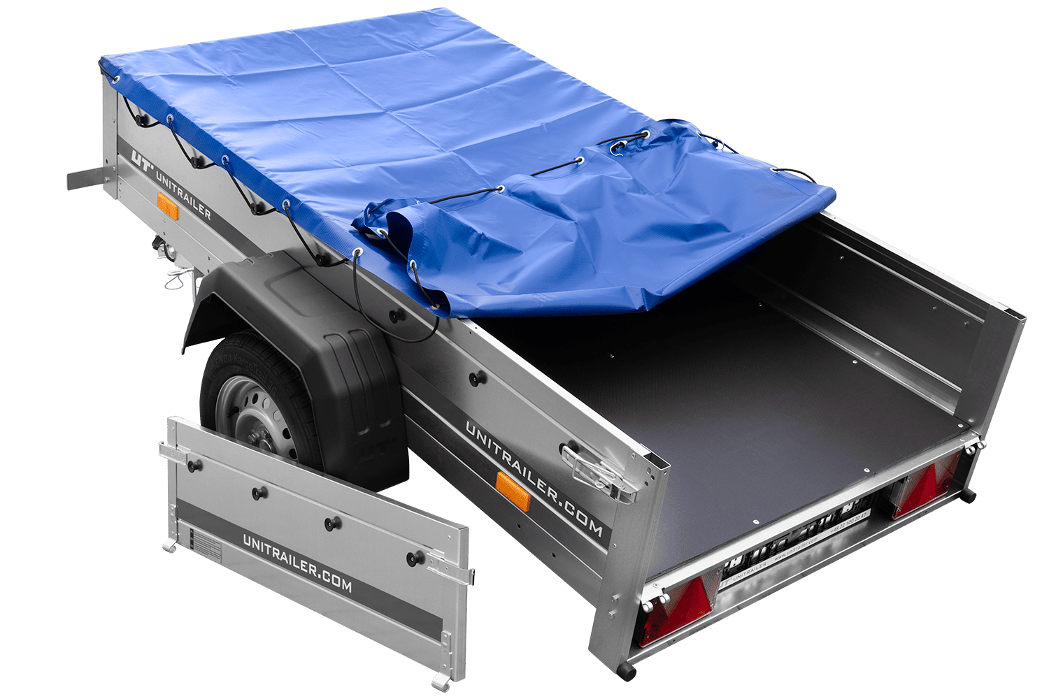 - Garden Trailer 200 Kipp s modrou plachtou a opěrným kolečkem.