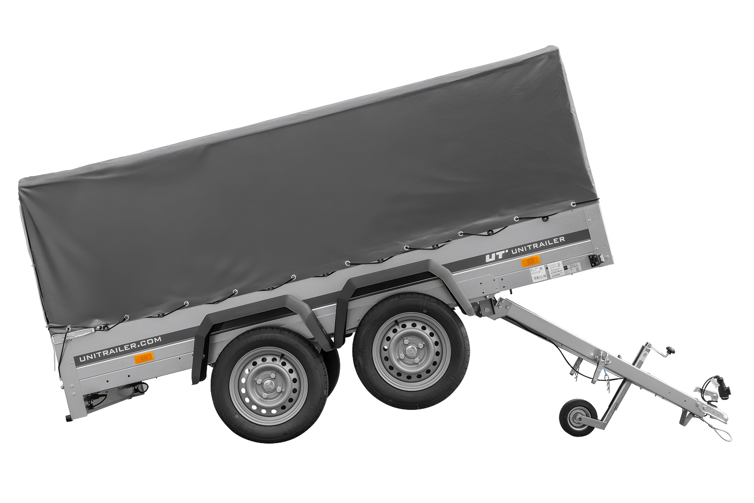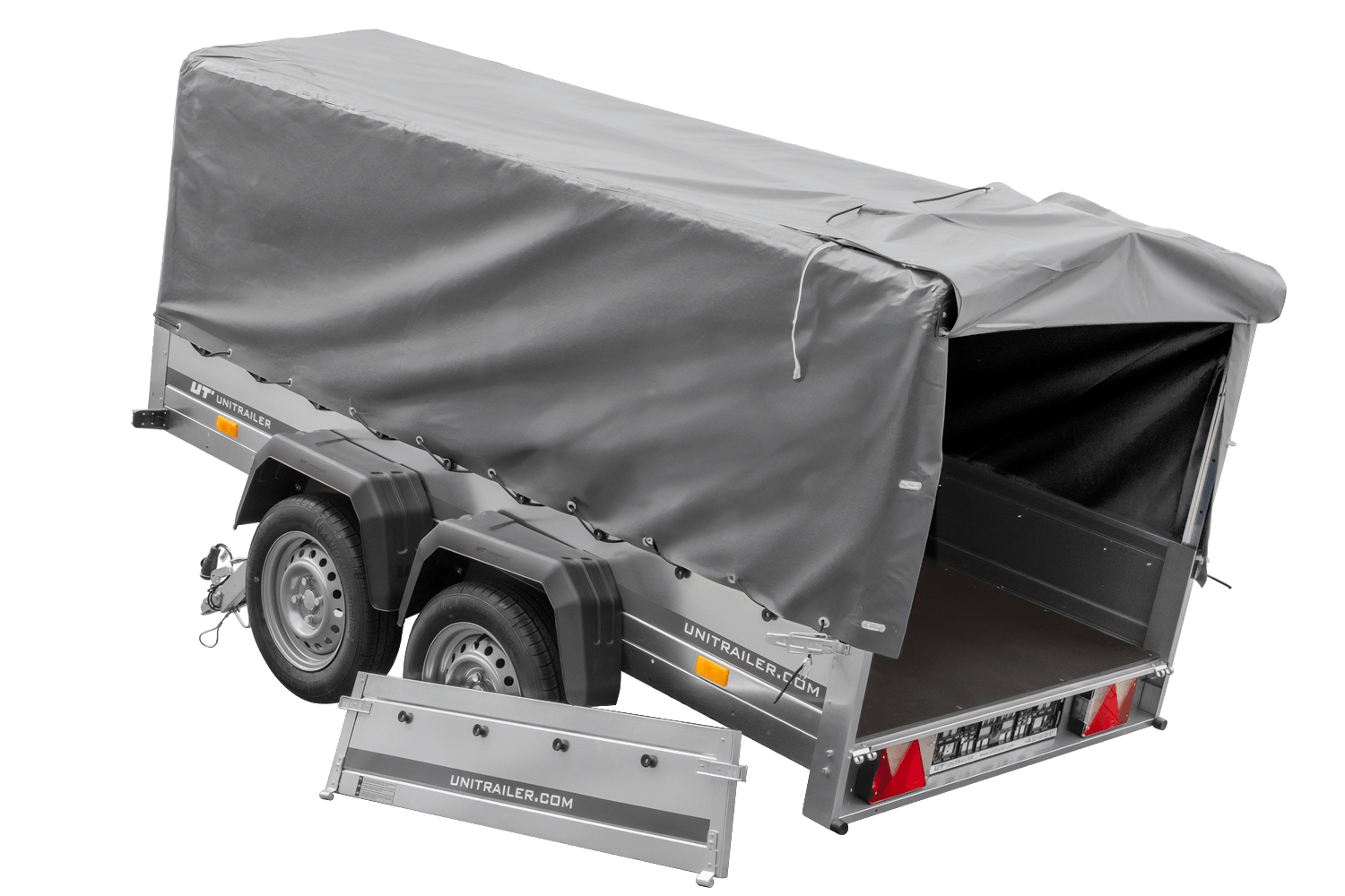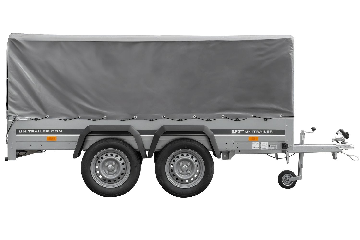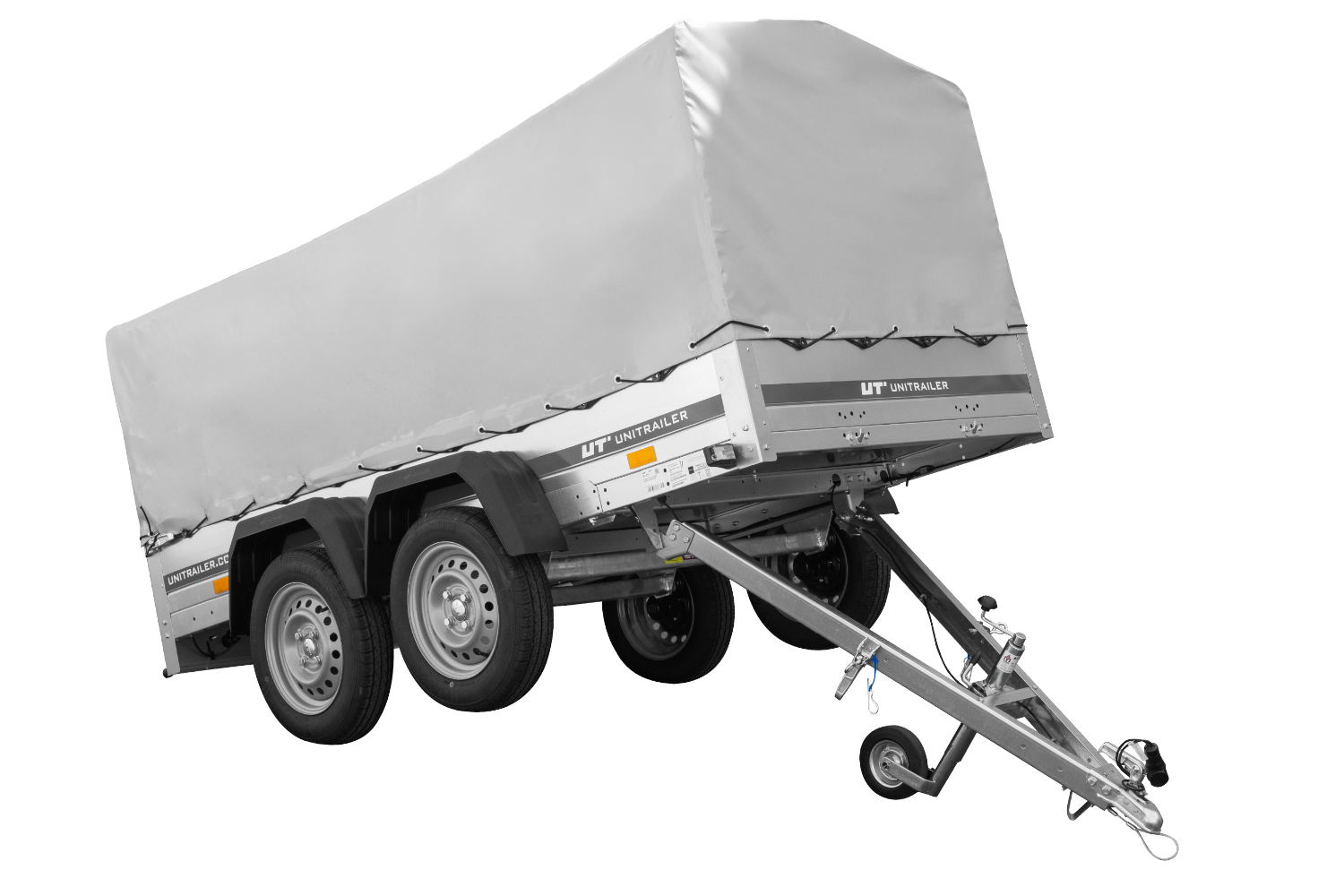 - Dvounápravový přívěs Unitrailer Garden Trailer 264/2 KIPP v sadě s opěrným kolečkem, 80cm rámem a dedikovanou šedou plachtou.