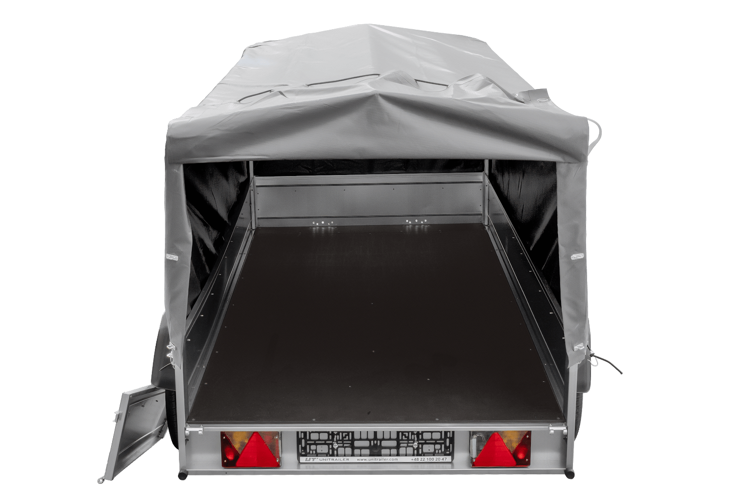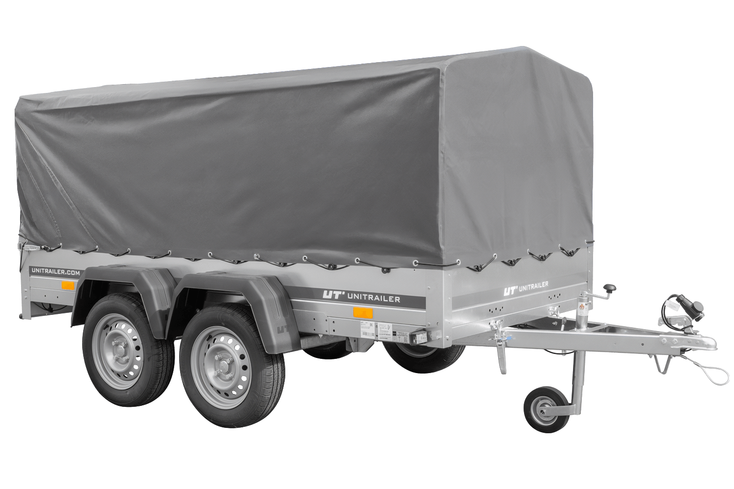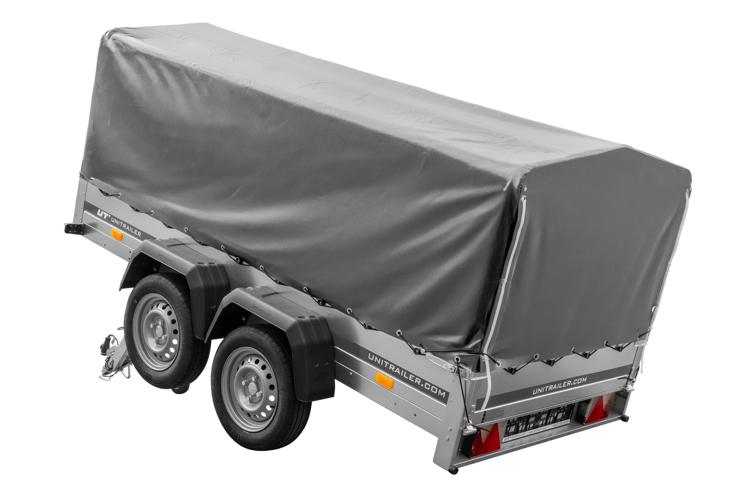 - Dvounápravový přívěs Unitrailer Garden Trailer 264/2 KIPP v sadě s opěrným kolečkem, 80cm rámem a dedikovanou šedou plachtou.