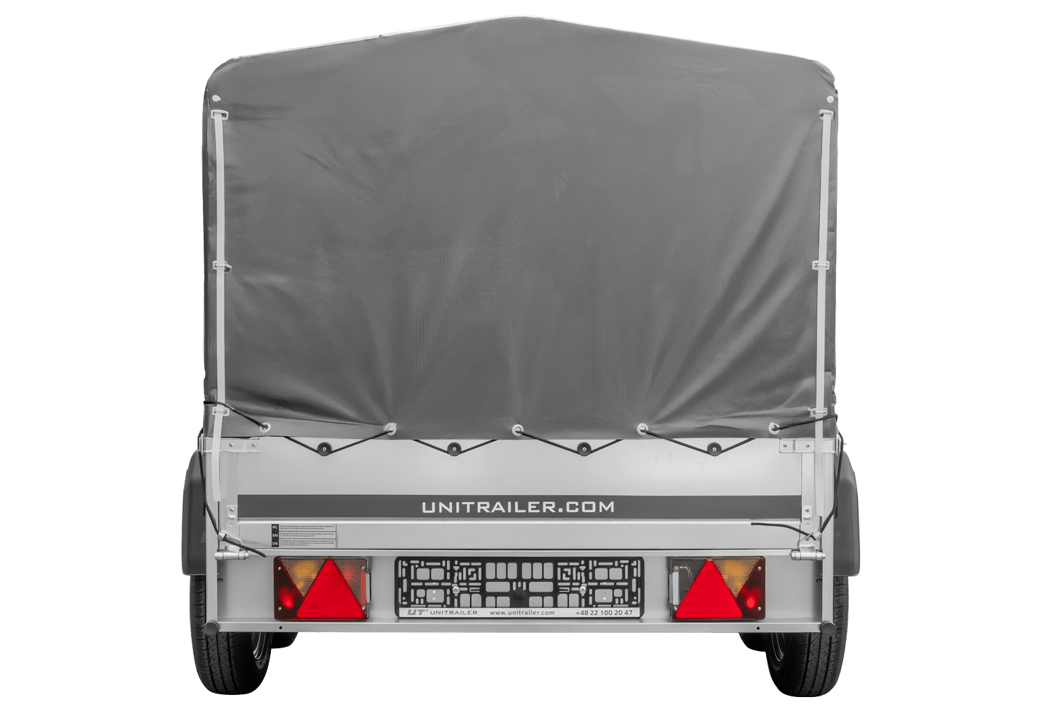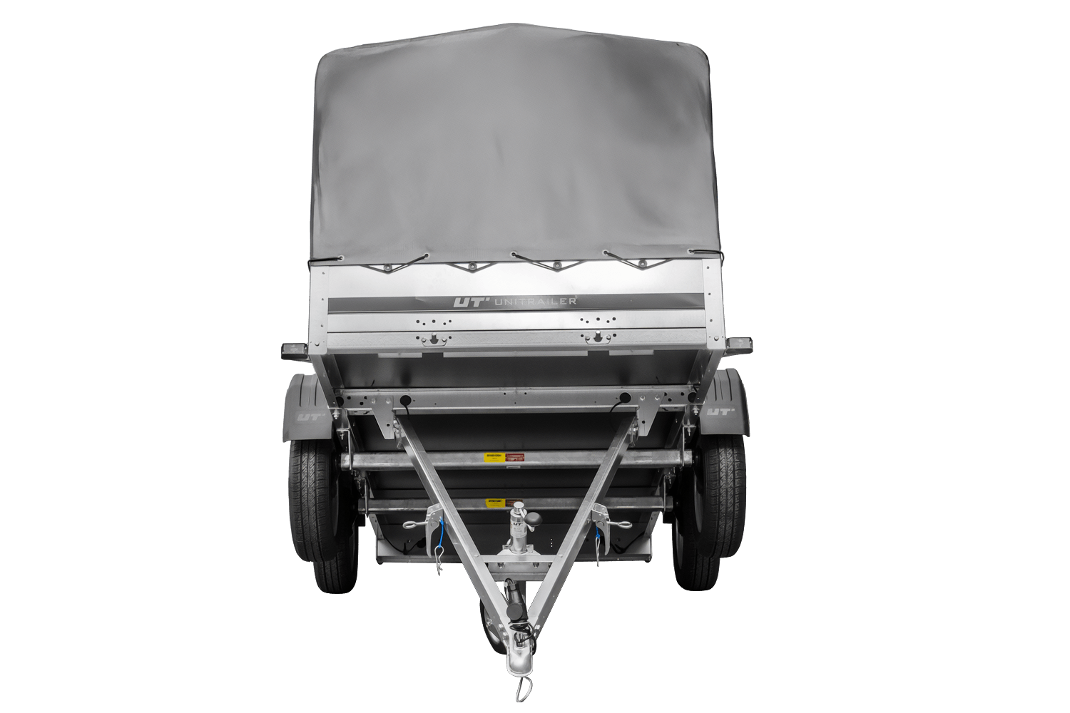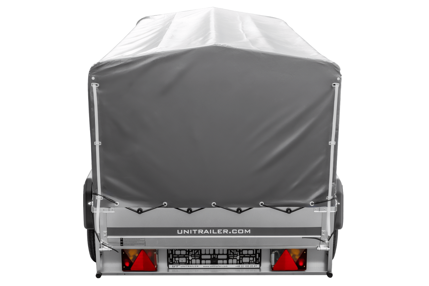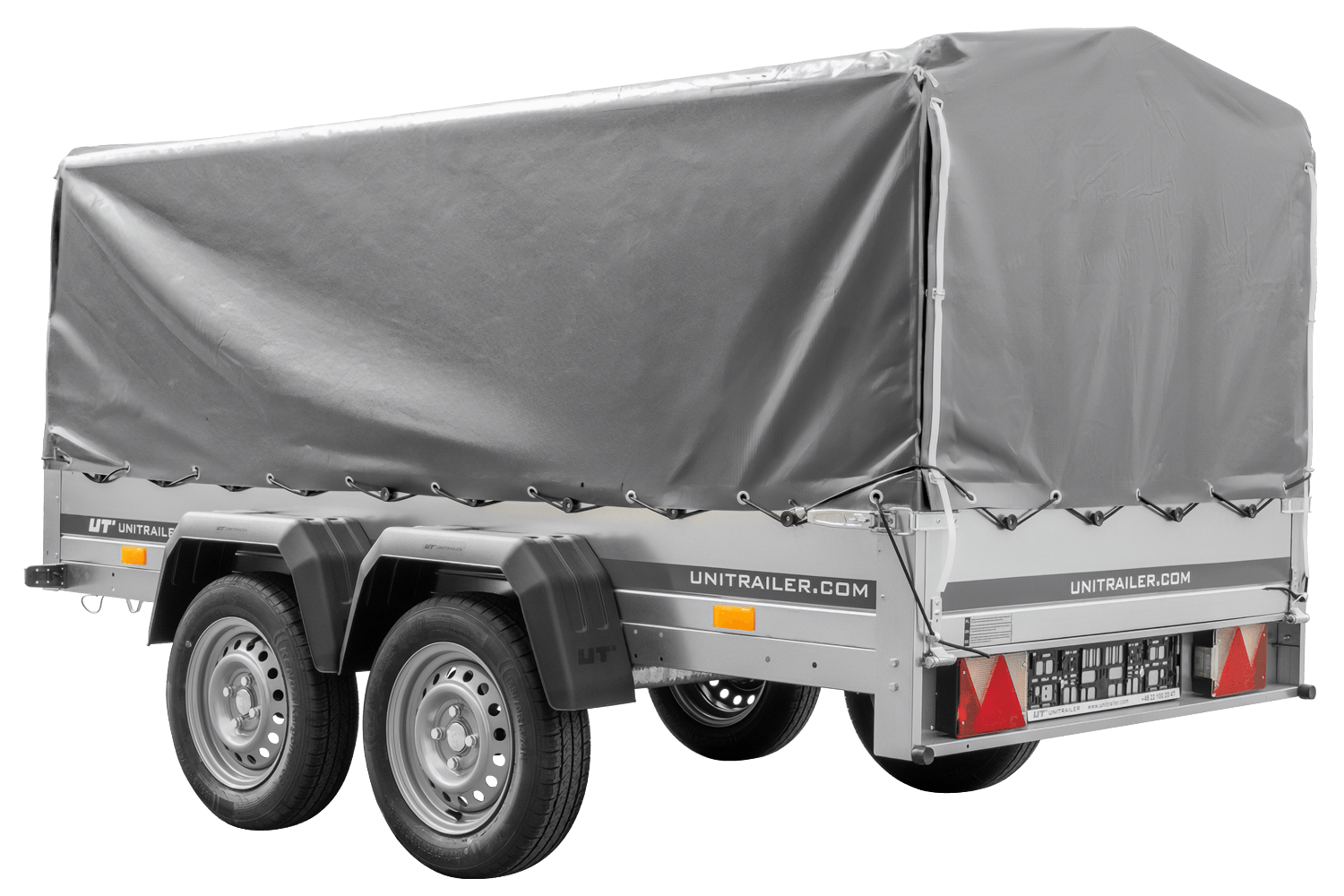 - Dvounápravový přívěs Unitrailer Garden Trailer 264/2 KIPP v sadě s opěrným kolečkem, 80cm rámem a dedikovanou šedou plachtou.