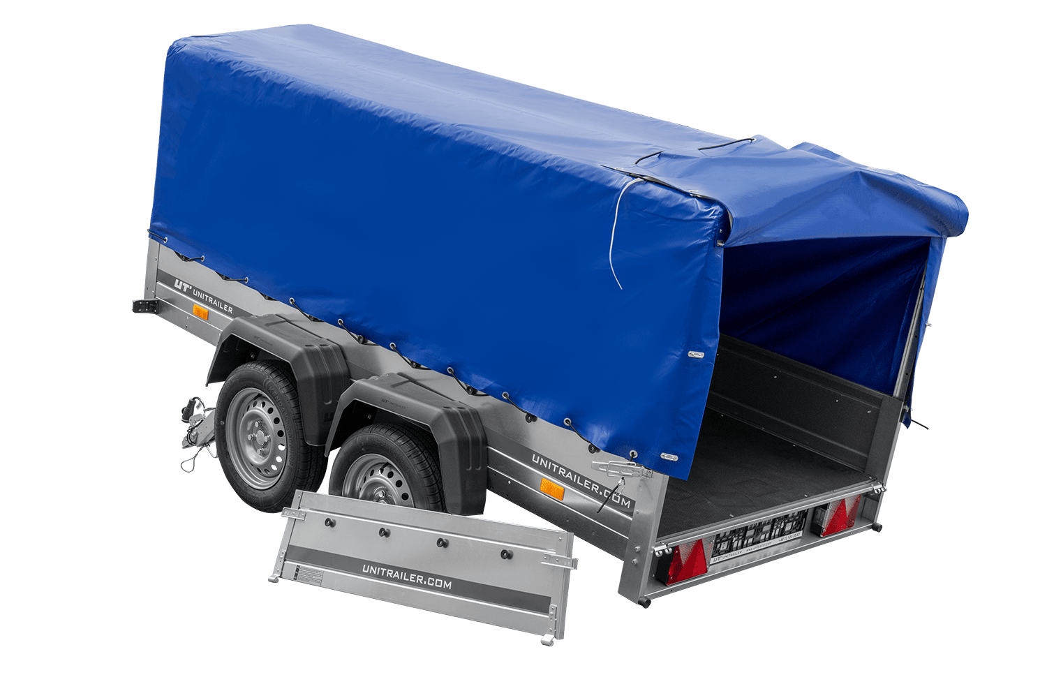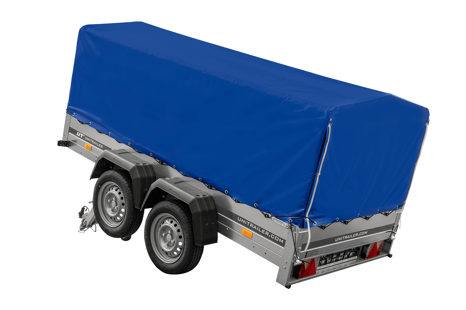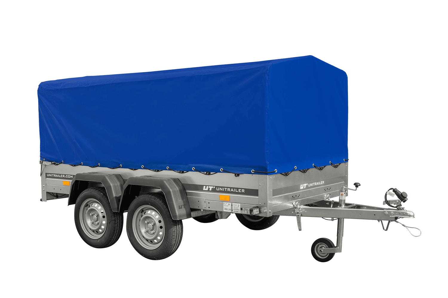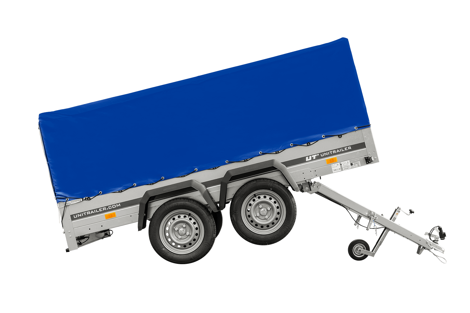 - Dvounápravový přívěs Unitrailer Garden Trailer 264/2 KIPP v sadě s opěrným kolečkem, rámem 80 cm a dedikovanou modrou plachtou.
