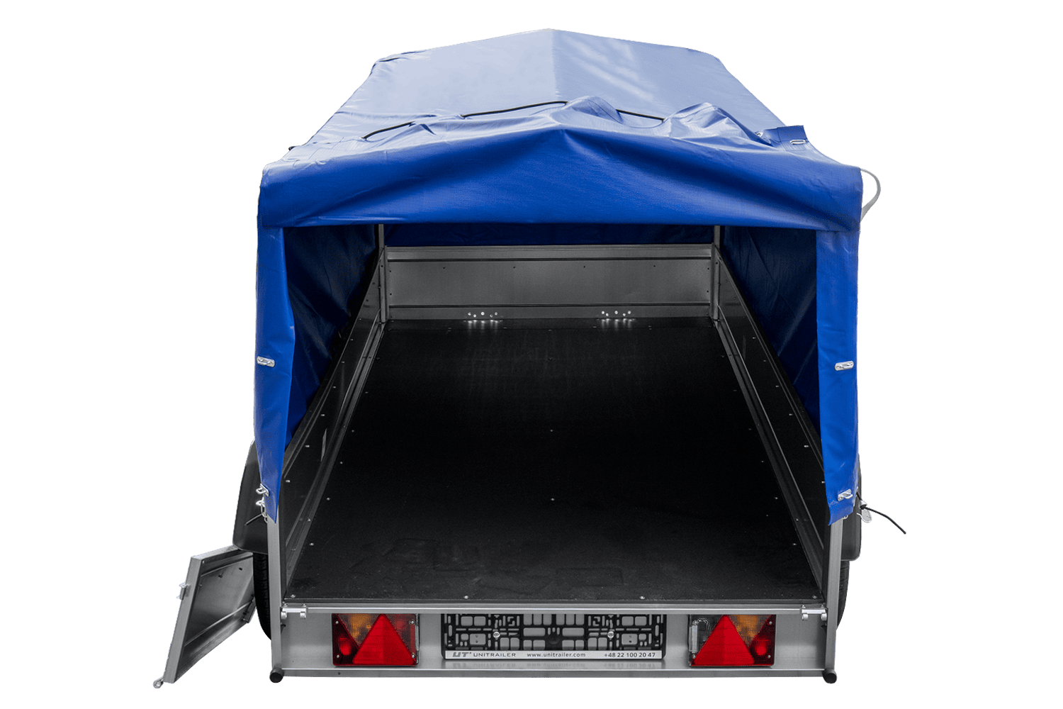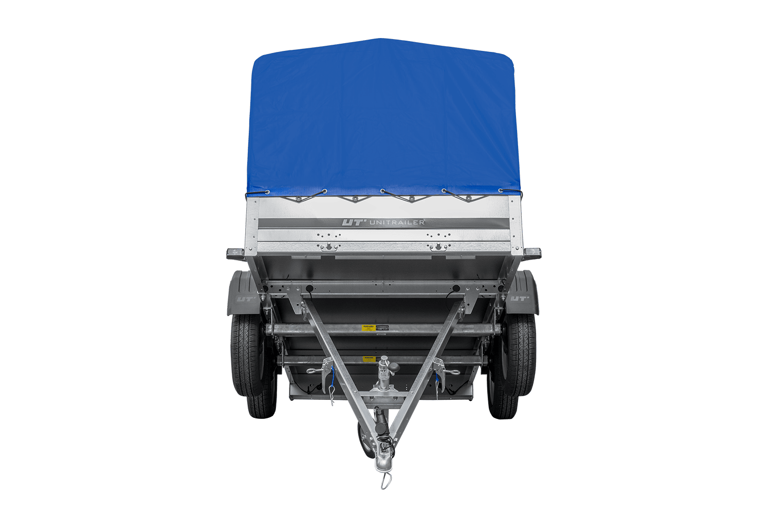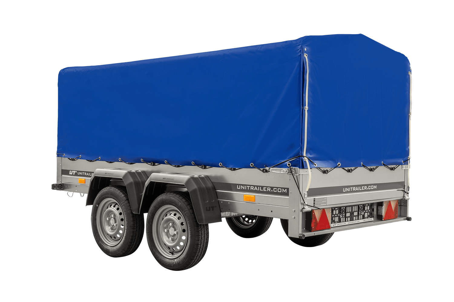 - Dvounápravový přívěs Unitrailer Garden Trailer 264/2 KIPP v sadě s opěrným kolečkem, rámem 80 cm a dedikovanou modrou plachtou.