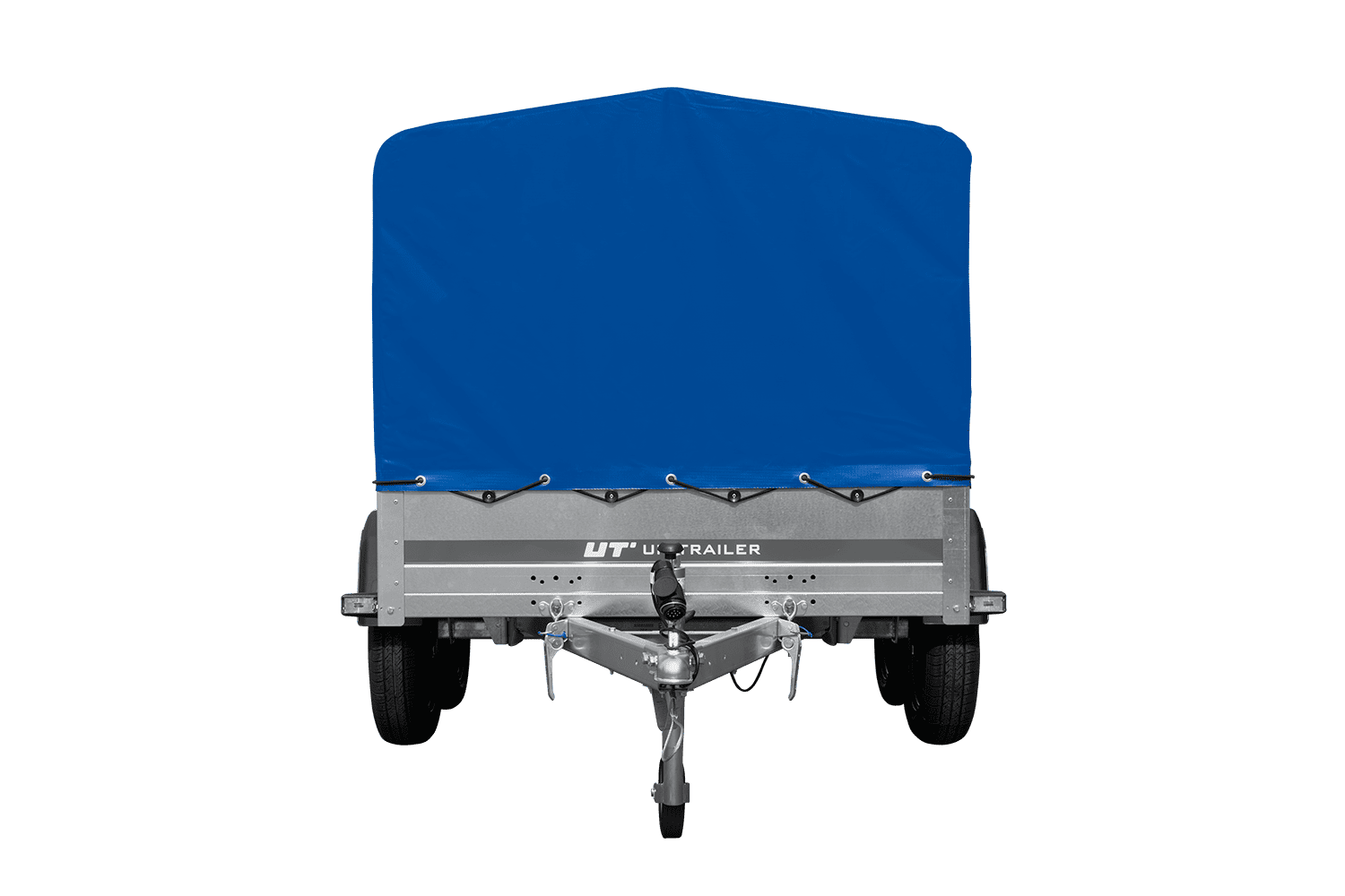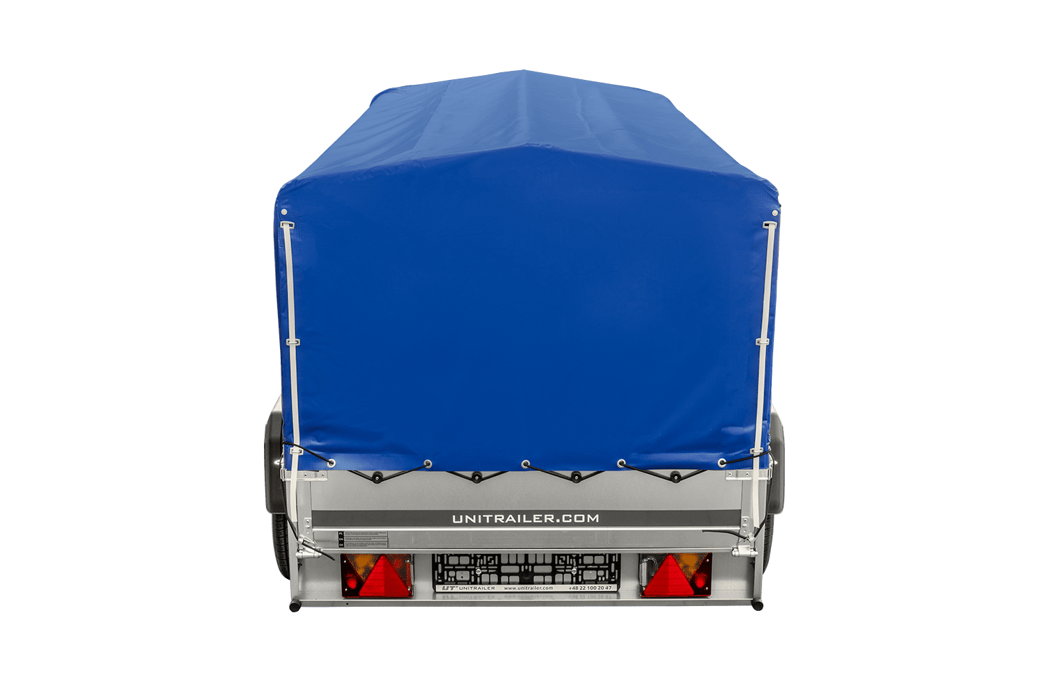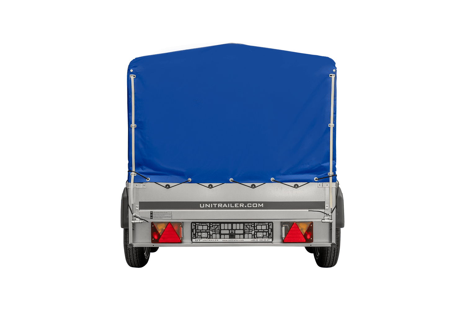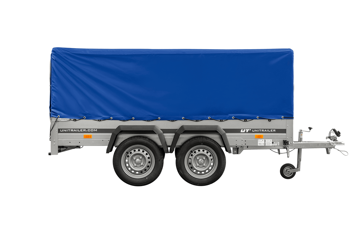 - Dvounápravový přívěs Unitrailer Garden Trailer 264/2 KIPP v sadě s opěrným kolečkem, rámem 80 cm a dedikovanou modrou plachtou.