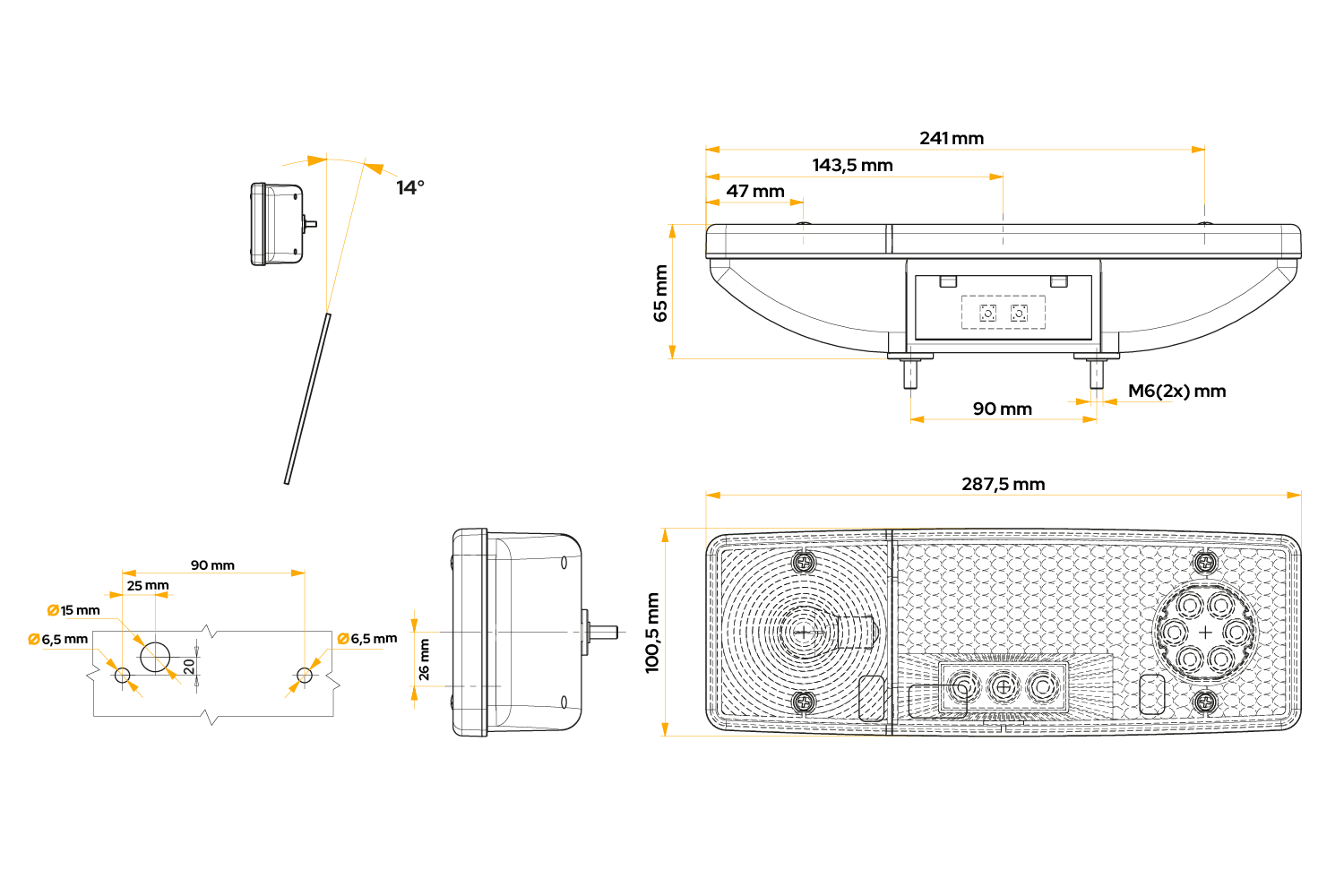 Zadní svítilna WE549L od WAŚ je určena pro montáž na levou stranu vozidla a má následující rozměry: šířka 287,5 mm, výška 100,5 mm, hloubka 65 mm . Na zadní straně svítilny je průchodka , která usnadňuje připojení kabelu, takže je ideálním řešením pro použití v přívěsech, autobusech a odtahových vozech .