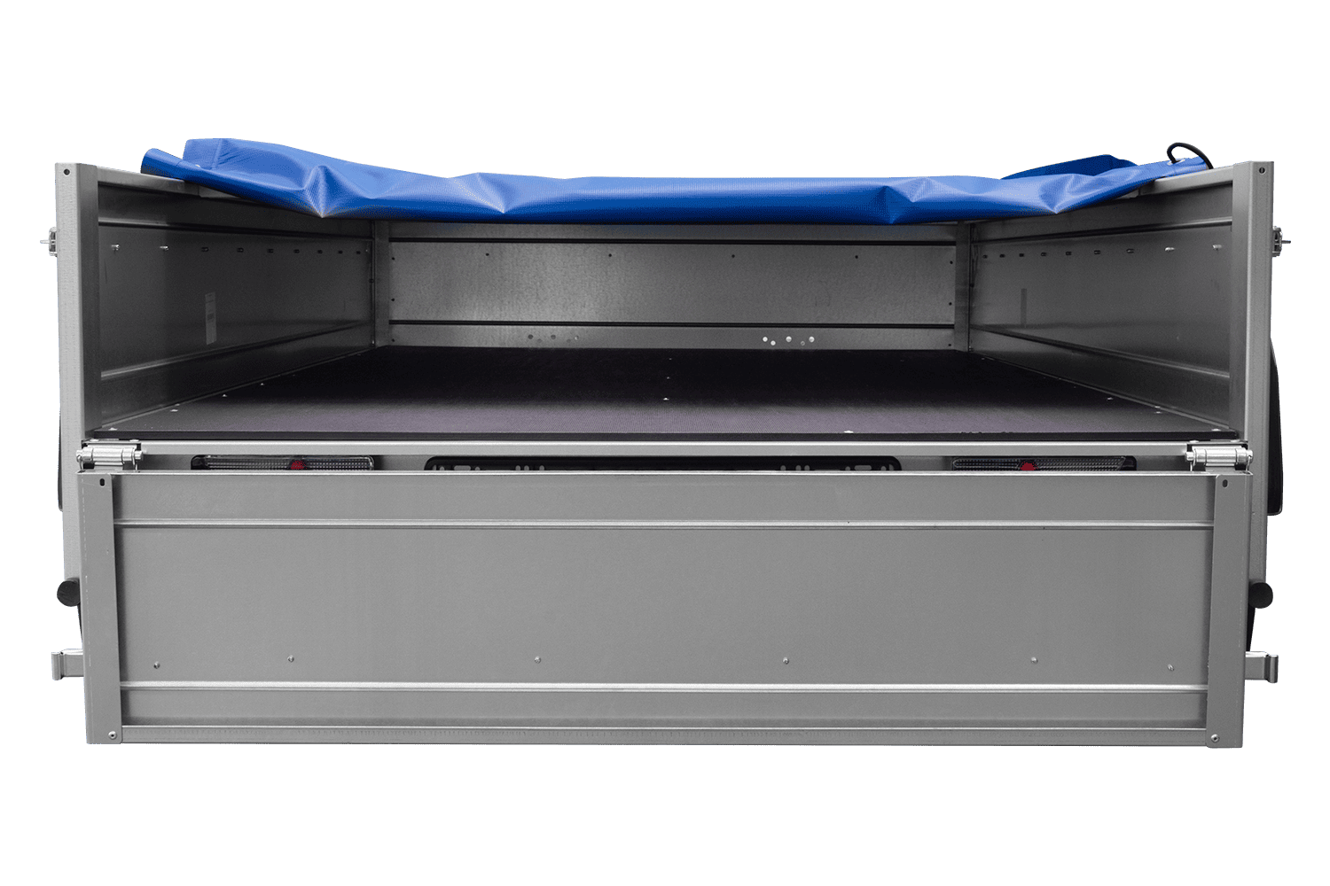 - BOČNICE - celková výška 30 cm z odolné pozinkované oceli, chráněné proti korozi. Vícenásobně ohnuté pro větší tuhost. S držáky na lano umožňující správné natažení plachty. Zadní bočnici lze otevřít nebo zcela demontovat.